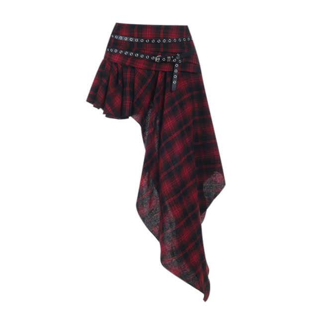 オリジナルデザイン:非対称チェック柄スカートを独自デザイン、ダークスタイルとトレンド要素を融合し、個性的なファッションを演出。