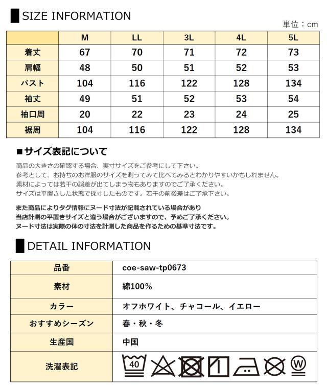 5L:着丈73 肩幅53 バスト134 袖丈54 袖口周25 裾周134