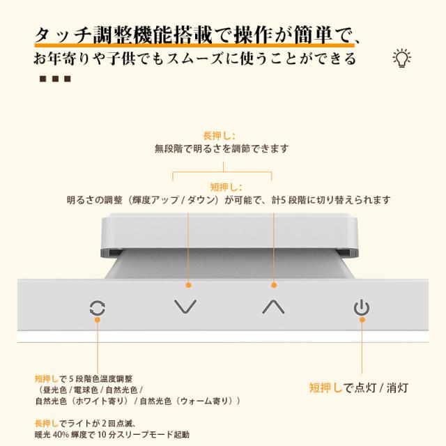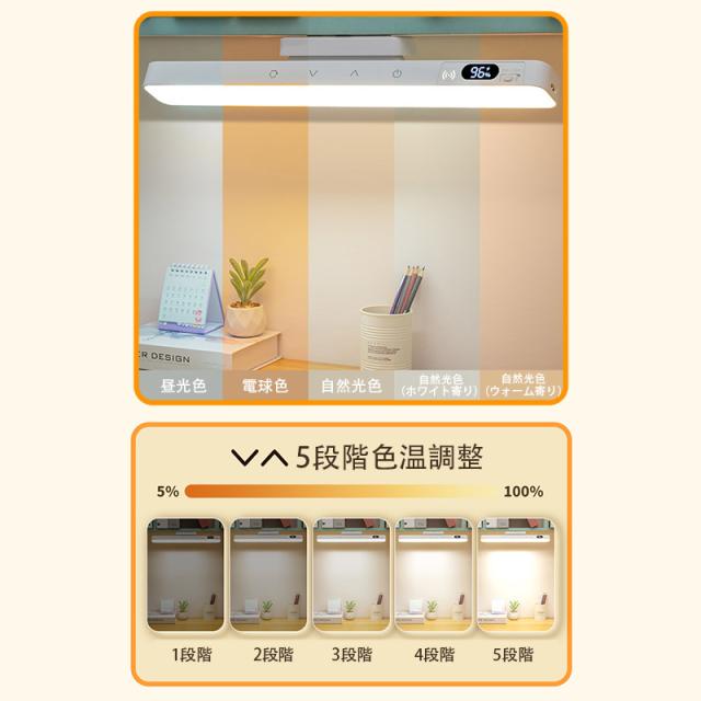 【5段階色温度切り替え】:暖色系から寒色系まで5段階の色温度に対応。作業時には清涼な白色光、リラックス時には柔らかい暖色光を選べ、目に優しい照明環境を作り出せます。