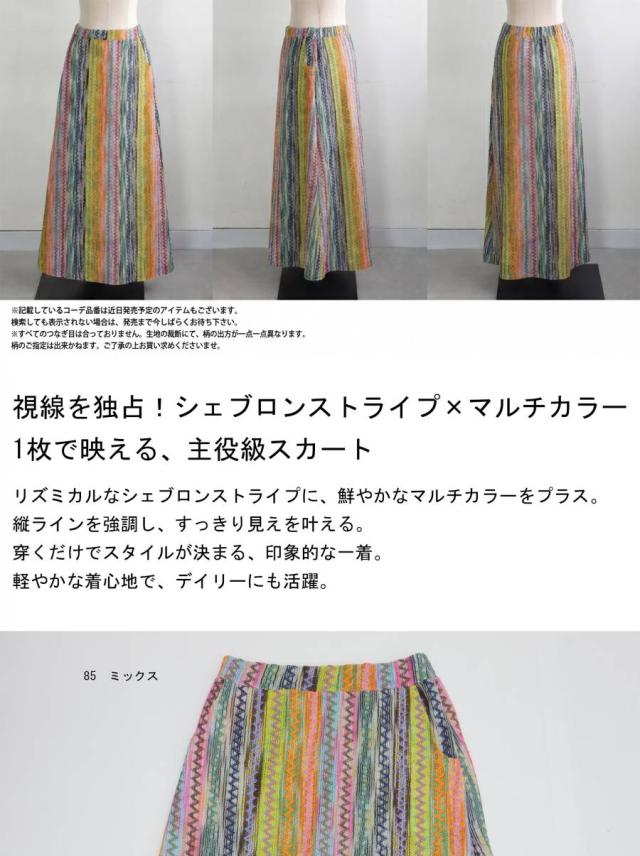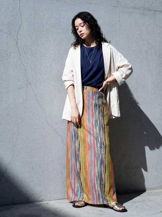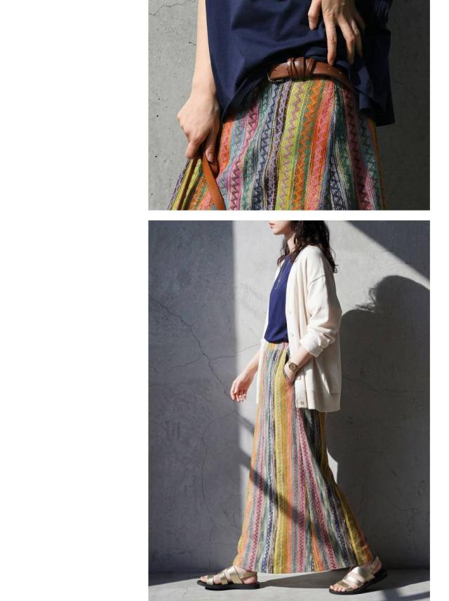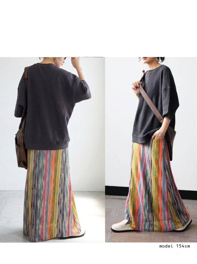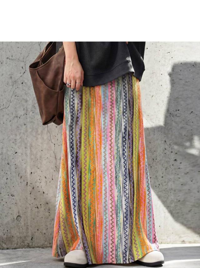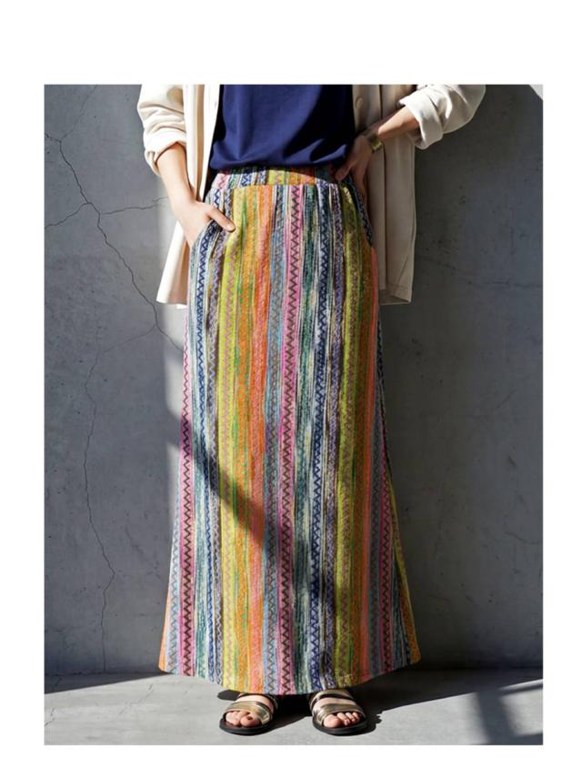 印象的なマルチカラー配色と幾何柄ストライプが目を惹くロングスカートです。