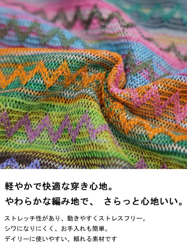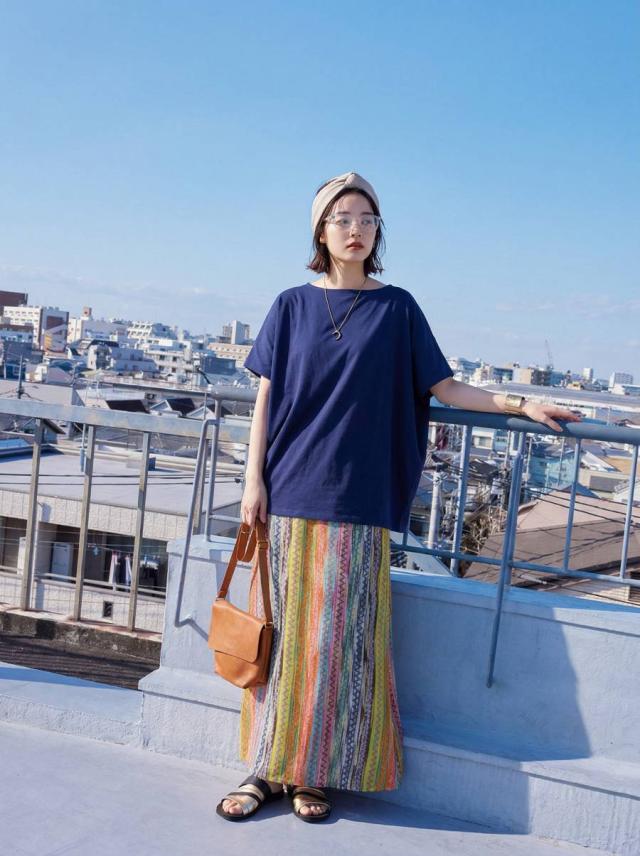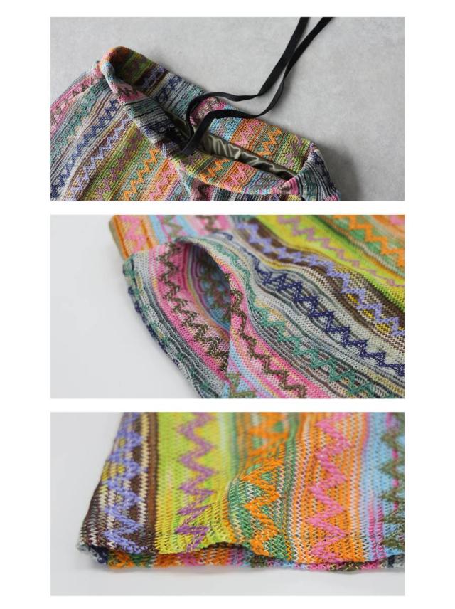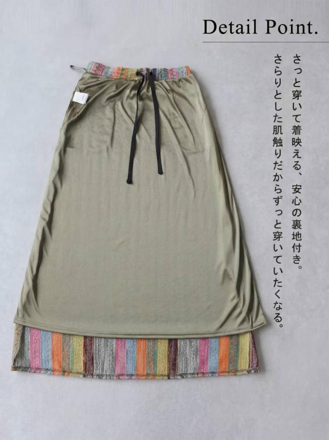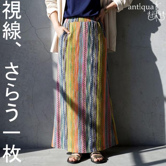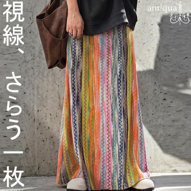 印象的なマルチカラー配色と幾何柄ストライプが目を惹くロングスカートです。