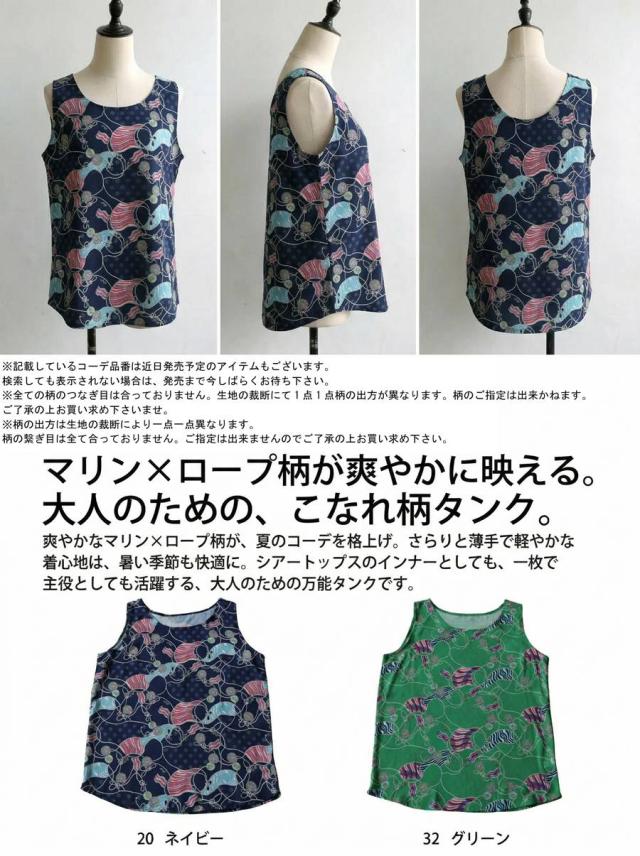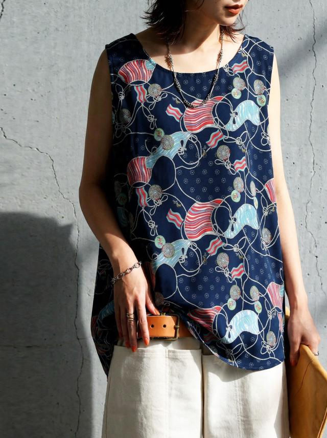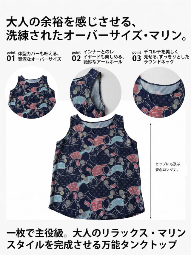 レトロマリン柄が印象的に映える、大人のための主役級タンクトップです。