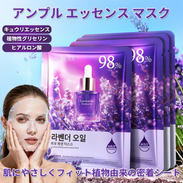 [10枚セット]アンプル エッセンス マスク 大容量、フェイスパック 個包装【ラベンダーエッセンス】活性成分配合、鎮静パック、ビタミン パック、美容マスク、極薄シルク生地、肌にやさしい密着シート、角質ケア 顔、毎日パック 10枚入り