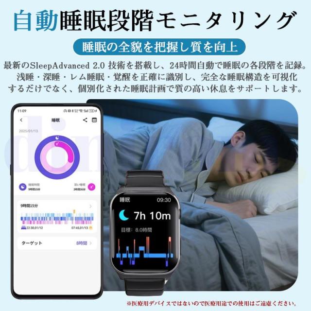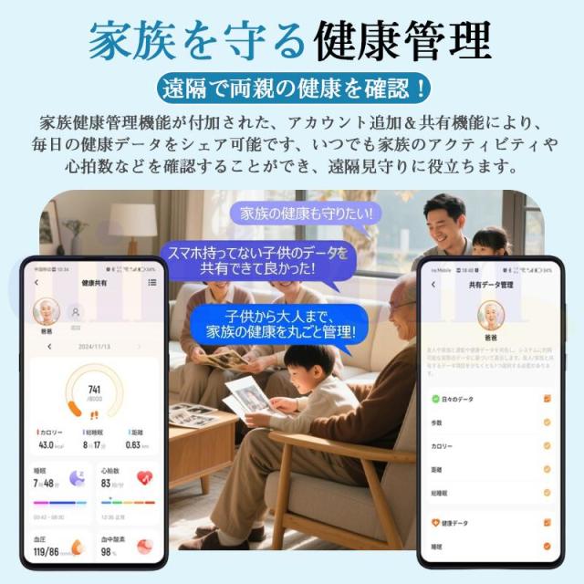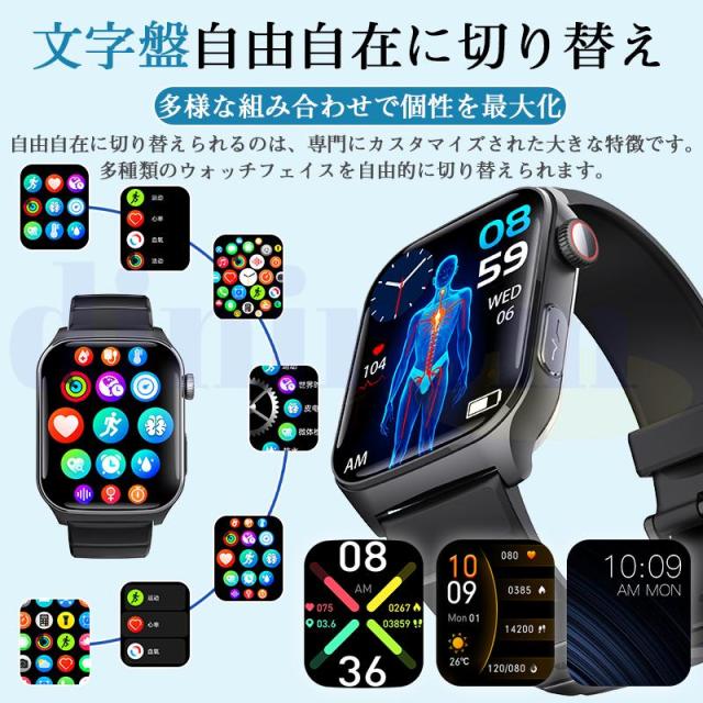 ●24H健康管理:ECG PPG心電図、血糖値評価、血液成分、体組成分析、多機能健康測定、血中脂質、尿酸、血圧、血中酸素、通話可能、カロリー、24時間体温監視、アラート、体温、睡眠監視や心拍数などの測定機能付き