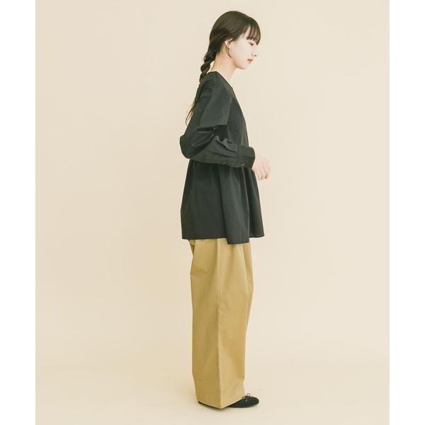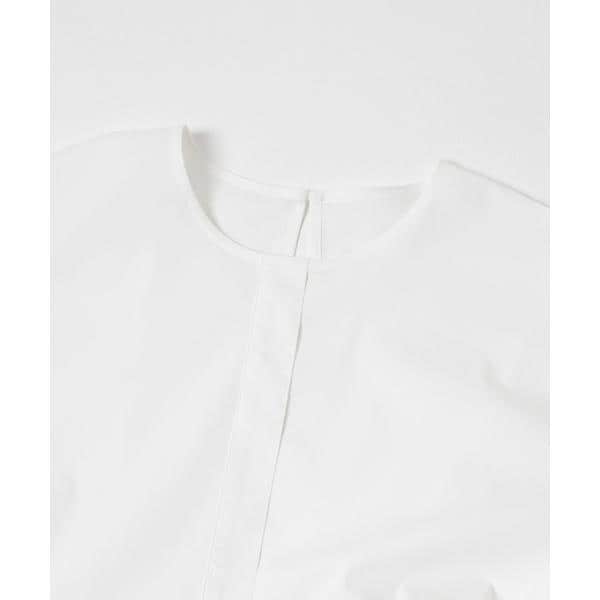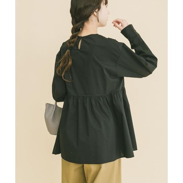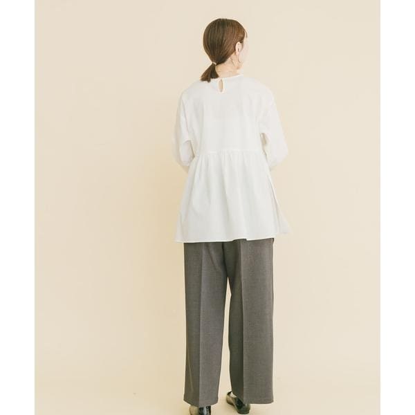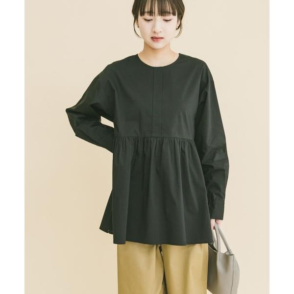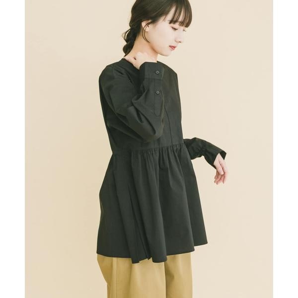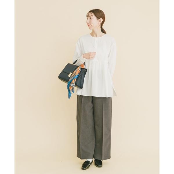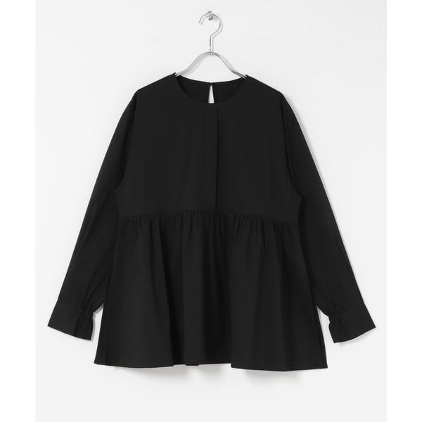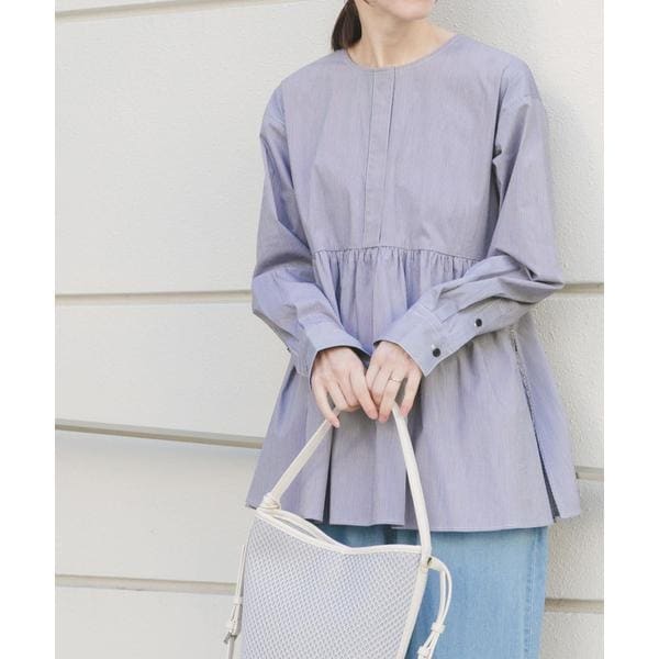 胸下からたっぷりとギャザーを寄せた、立体感のあるペプラムシルエットが魅力のブラウス。高めの切り替えで脚長効果を演出し、腰まわりやヒップを自然にカバーします。ノーカラー仕様で甘さを抑え、大人っぽく上品な印象に。袖口のシャーリングでボリューム調整も可能。パンツと合わせるだけで着映えし、きれいめからカジュアルまで幅広く活躍します。