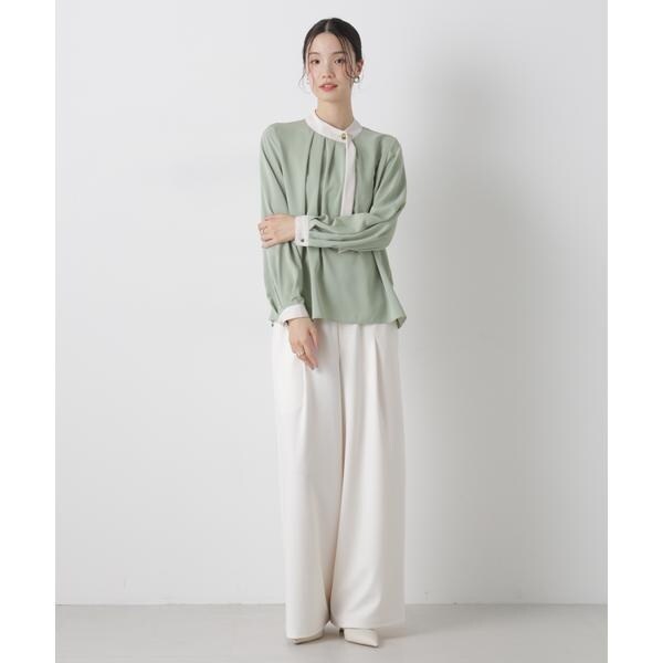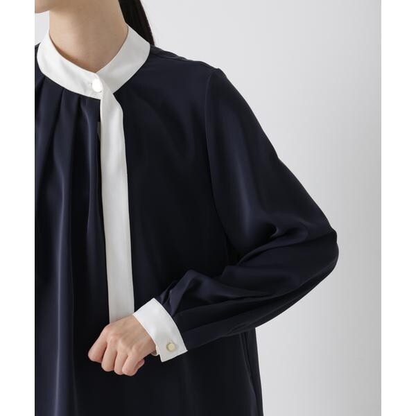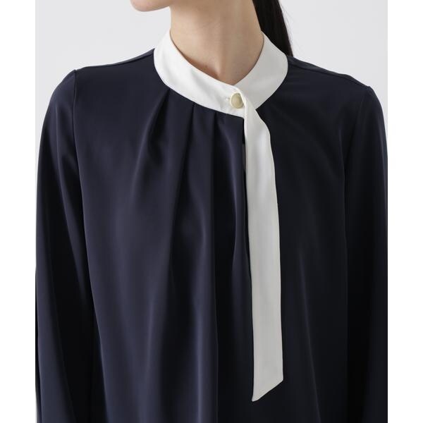 衿と袖のバイカラーとフロントに入ったタックが華やかなボータイブラウス。シンプルながらも上品さと女性らしい雰囲気を演出してくれるので、ON/OFFで様になる着映えアイテムです。