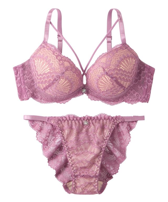 クロスストリング×総レースデザインでセクシーに胸元を彩るブラセット。 脇高×ソフトワイヤ仕様で気になる脇肉もスッキリ&体に優しくフィット 下厚モールドカップで美しいバストラインヘ。 詳しいショーツサイズについては詳細画像内サイズ表を参考にお持ちのショーツと比較してみてください。