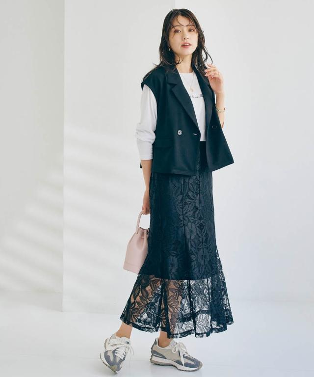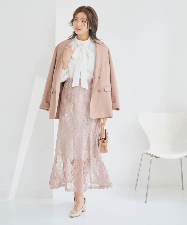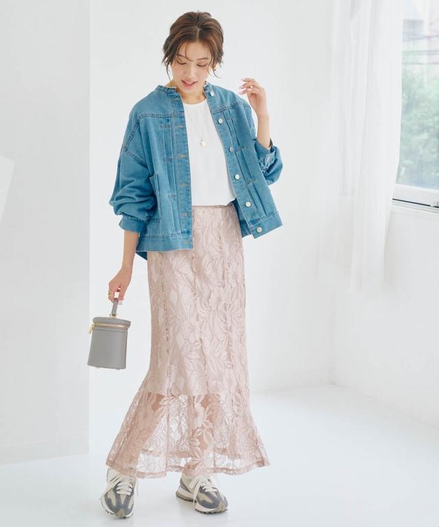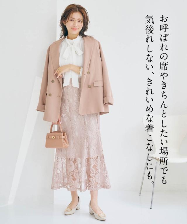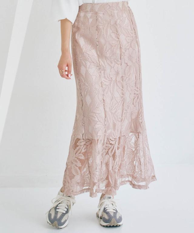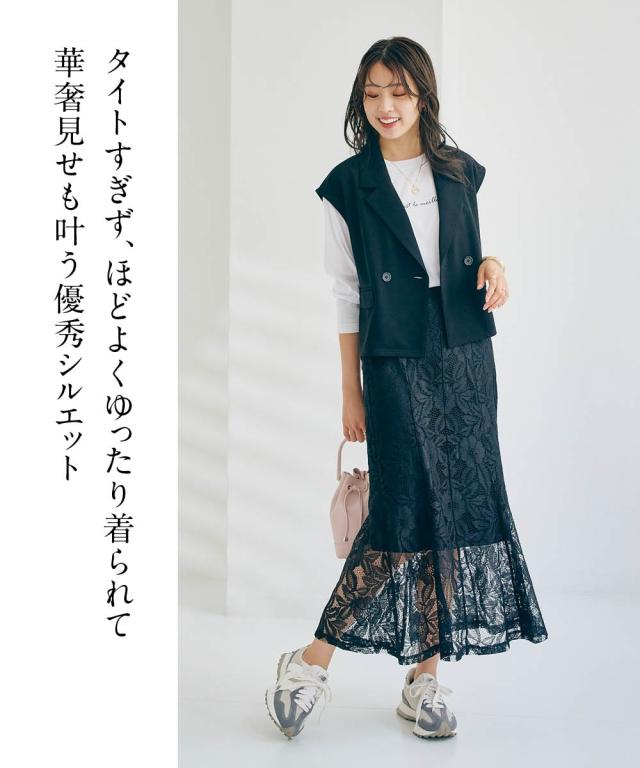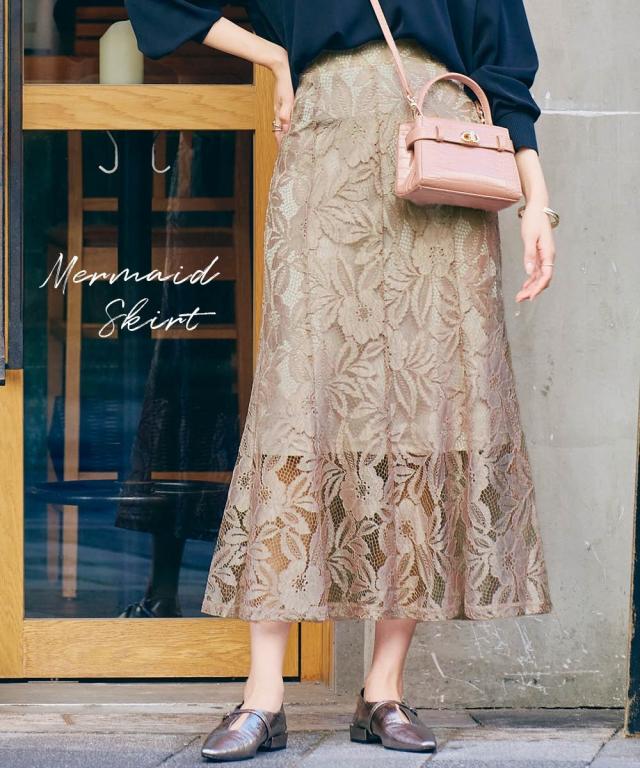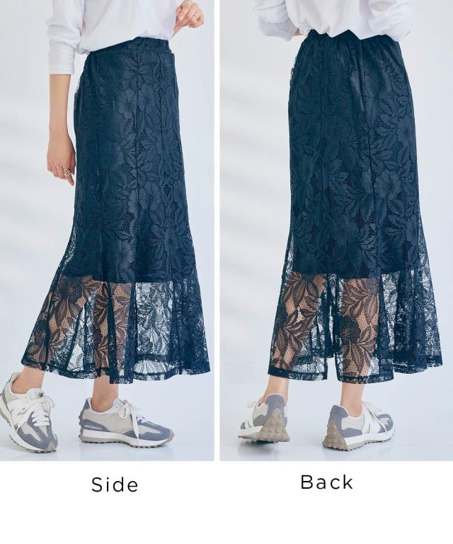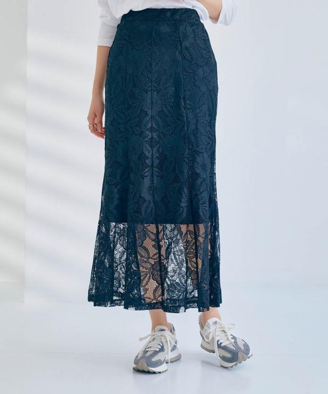 曲線美で際立つ、総レースのマーメイドスカート ■デザイン 裾に向かって優雅に広がるマーメイドシルエットは、女性らしい曲線美を際立たせながらも、気になるヒップラインや太ももをさりげなくカバーし、スタイルアップ効果も期待できます。繊細なレース使いが上品な透け感を演出し、軽やかで洗練された印象を与えます。入学式や卒業式、ちょっとしたパーティーやお呼ばれコーデにも使えるデザイン。カジュアルトップス合わせできれいめカジュアルにも。 ■素材 やや光沢感のあるレース素材を使用。裏地付きなので透けも気にせず着用いただけます。膝下はあえて透け感を残し、ヌケ感のある軽やかな着心地。 ■おすすめのスタイリング ブラウスやジャケット合わせでONスタイルに。Tシャツやニット、デニムジャケット合わせでOFFスタイルに。OFFスタイルにはスニーカー合わせがおすすめ。