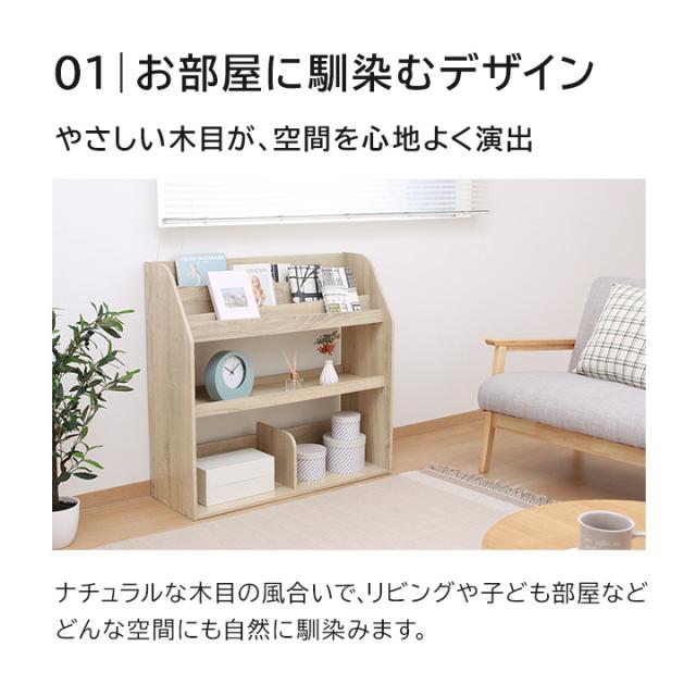 | ■ ナチュラルな木目が美しく、優しくお部屋に馴染みます。 ■ 上段には絵本や雑誌などをディスプレイしながら収納できます。 ■ 中棚は可動棚になっているので、収納するものに合わせて高さ調節ができます。 ■ 下段にはバッグやおもちゃなどを収納!出し入れしやすく、使い勝手もバツグンです。 ■ 高さ80cmのロータイプで、大人も子供も無理なく使えるサイズです。 ■ お子様も安心して使えるように、本棚正面の角は丸くデザインしています。 |