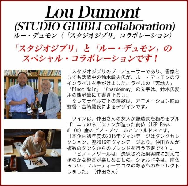 ![]() ■葡萄品種:メルロー70%、シラー15%、グルナッシュ15% ■樹齢:平均樹齢20年 ■土壌:粘土石灰質土壌 ■発酵・熟成:ステンレスタンクで発酵後、約半年間熟成 「スタジオジブリ」×「ルー・デュモン」!鈴木敏夫プロデューサーと仲田晃司のコラボレーション! この度、スタジオジブリのプロデューサーであり書家としても活躍中の鈴木敏夫氏が、仲田晃司氏プロデュースのワインラベルを手がけました! ラベルの「天地人」「Pinot Noir」「Chardonnay」「紅の豚」の文字は鈴木氏愛用の熊野筆にて書き下ろし、ラベル右下の落款は、アニメーション映画監督・宮崎駿氏によるデザイン! 仲田晃司氏のコメント 「ピノ・ノワールは、洗練された果実味に加えてほのかな樽香が楽しめるもの。シャルドネは、南仏らしい、フルーティーでコクのあるものをセレクトしました。4つの貴品種をブレンドした「紅の豚」は、バランスが良く複雑な味わいが特徴です」 |