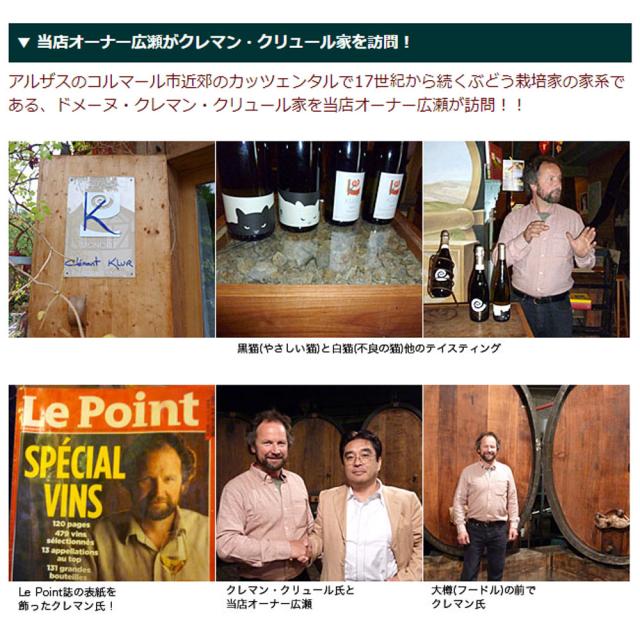 ![]() ピノ・ブラン60%、ピノ・オーセロワ40%のブレンドによる辛口のクレマンで、両品種ともに、樹齢40年以上の古樹のぶどうのみで造られています。ビン熟成は18ヶ月間以上。ドザージュは3g/lです。 クリュールさんの弟さんはなんと日本に住んでいるのですが(郵便関係のお仕事をされているそうです)、昔、弟さんを訪ねてクリュールさんが観光で来日した折、土産物屋で左手を挙げている招き猫と出会い、「人を招く」という話が大変気に入って購入されたのだそうです。今でもドメーヌの試飲用スペースに飾ってあるその招き猫に着想を得て、「クリュール流に」ラベルデザインをアレンジされた、特別キュヴェです。 ![]() ![]() |