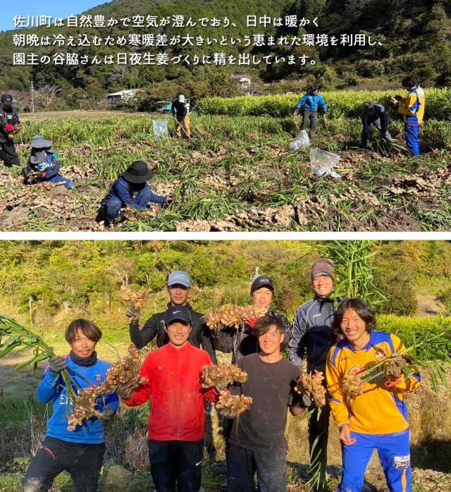さらに日中は暖かく朝晩は冷え込むという恵まれた環境を利用して、園主の谷脇さんは生姜作りに日夜精を出しています。爽やかで強い香り、上品でマイルドな食感を求め日夜努力を重ねたこだわりの生姜を生産して全国のお客様に出荷しています。刻んだり、すり下ろしたり、煮込んだりと、様々な料理にくわえて美味しいしょうがをお楽しみください。