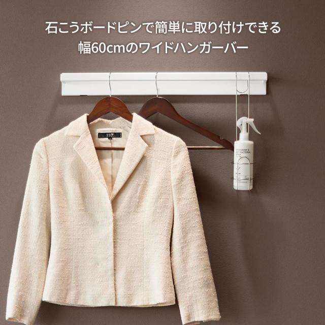 石こうボードピンで簡単に取り付けできる、幅60cmのワイドハンガーバー。