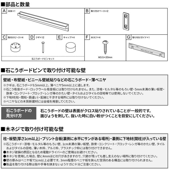 付属品:石こうボードピンセット(取り付けピース×4、クギ×12、キャップ×4)、木ネジ×4、取り付けガイド