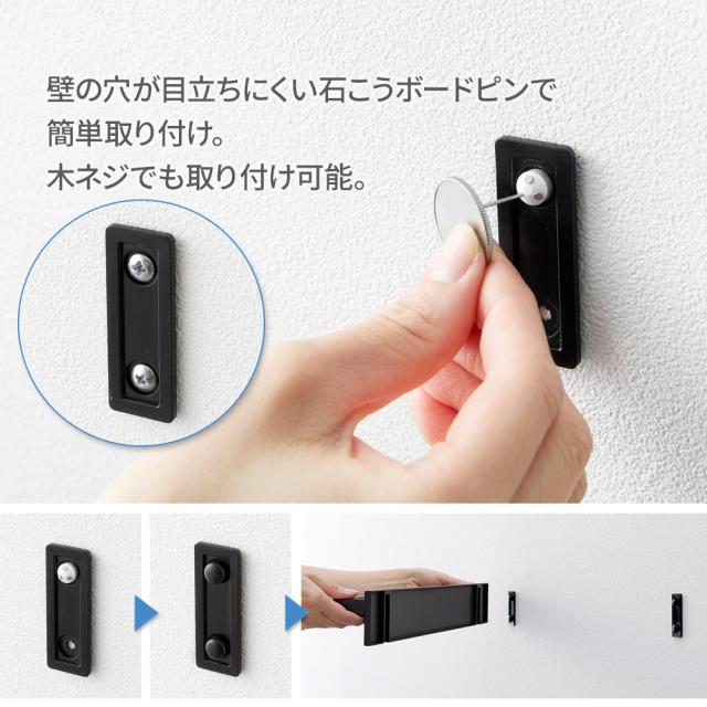 壁の穴が目立ちにくい石こうボードピンで簡単取り付け。木ネジでも取り付け可能です。