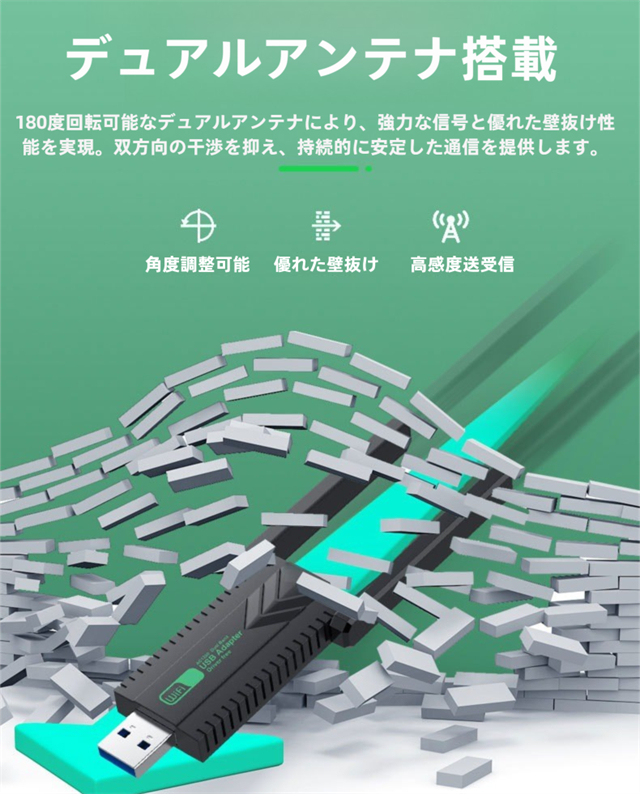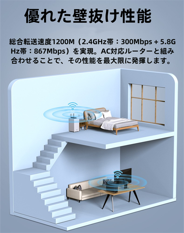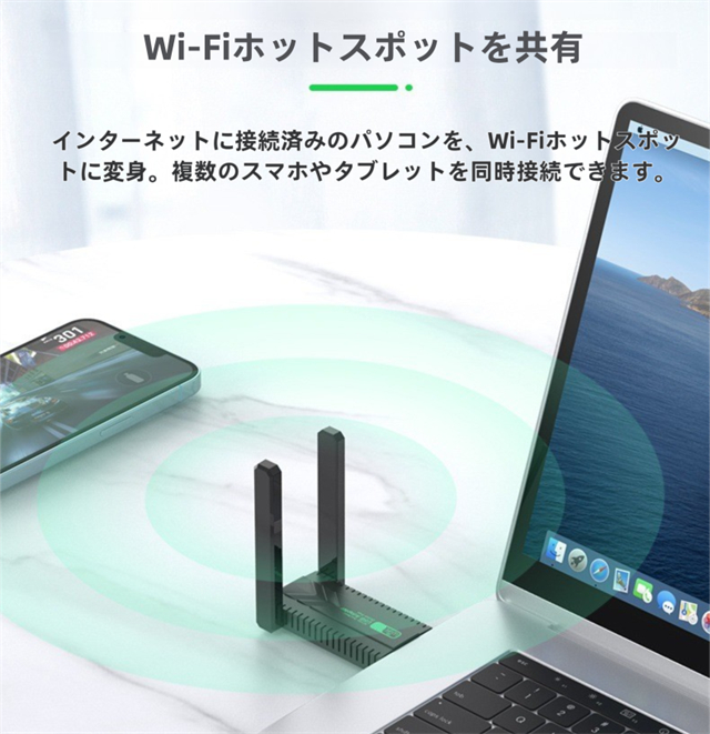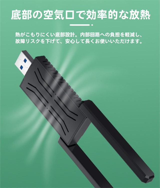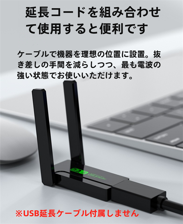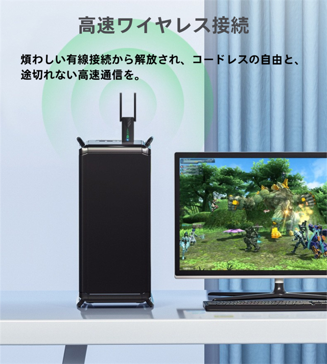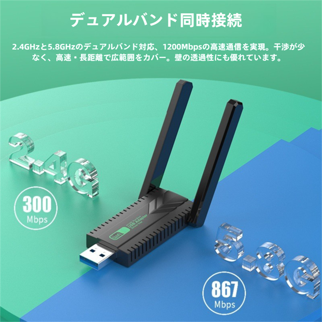 ・デュアルバンドで高速通信、接続デバイスが増えると通信速度が低下します。wifi usbはルーターとの距離が近く、またビデオやオンラインゲームをする場合、5Gバンドをおすすめします。無線 LAN 子機はルーターとの距離が遠く、またウェブサイトをサーフィンしたい場合、2.4Gを勧めです。