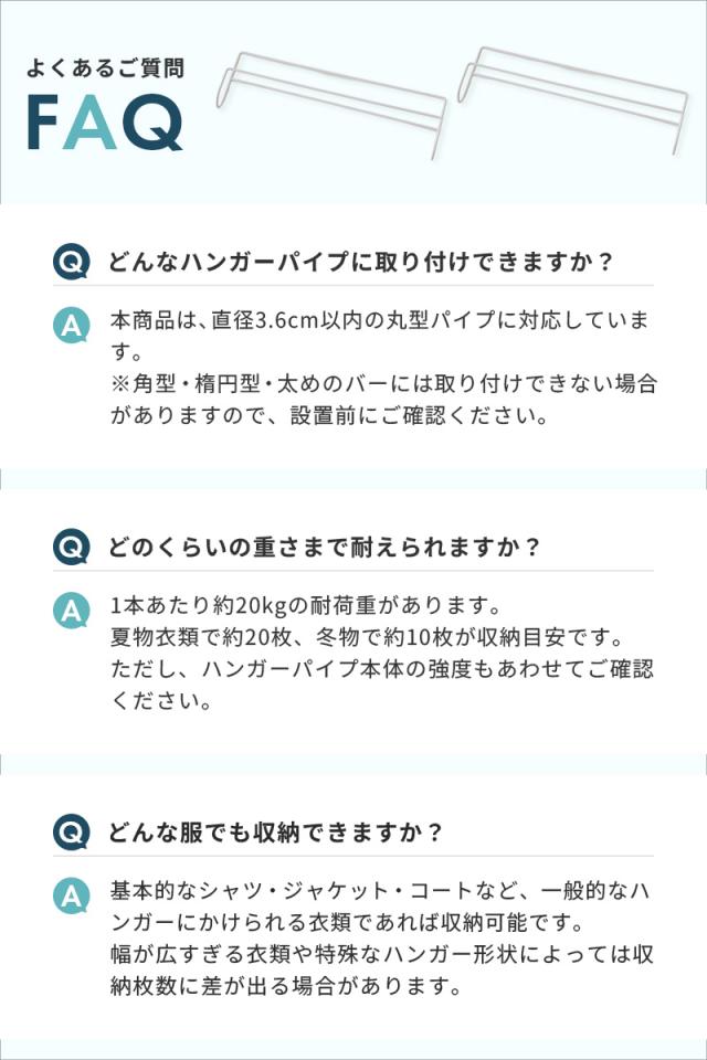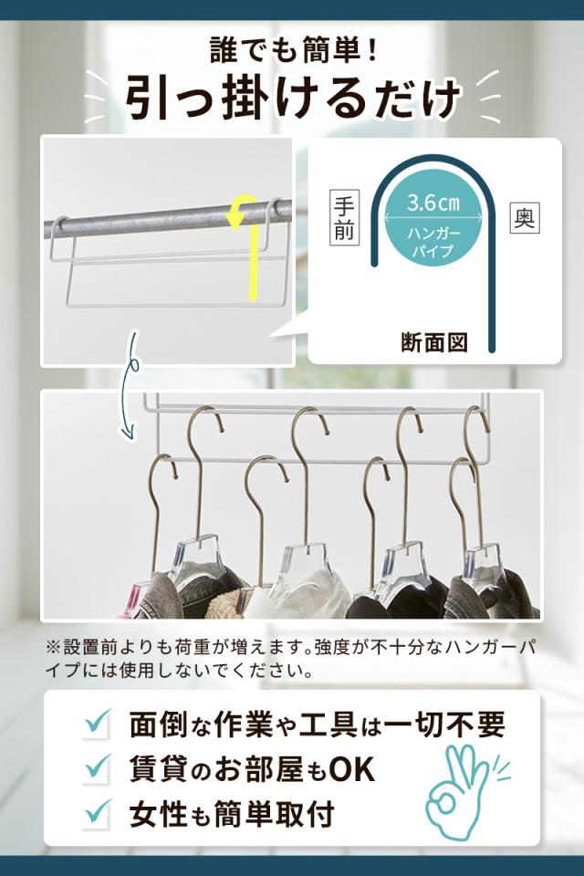 直径3.6cmを超えるパイプ、角型・楕円型・太めのバーには使用できない場合があります 設置後はハンガーパイプ本体の強度をご確認ください 耐荷重以内で均等に掛けて使用してください 無理な荷重や偏った掛け方は避けてください |
