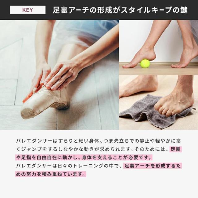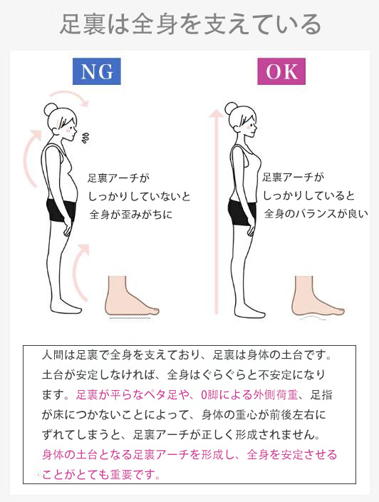 足指を使うことで足裏全体の筋肉が使われ、足裏アーチの形成につながります。足指で地面を捉える習慣づけを行うことで本製品を履いていない時も足裏の筋肉にアプローチすることができます。