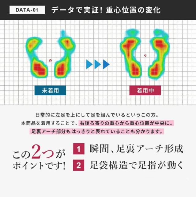 履くだけで足裏アーチを形成します。さらに、理想のアーチをサポートする立体縫製と、甲部分のクロスベルトが足裏の外側縦アーチ、内側縦アーチ、横アーチをつくり出します。
