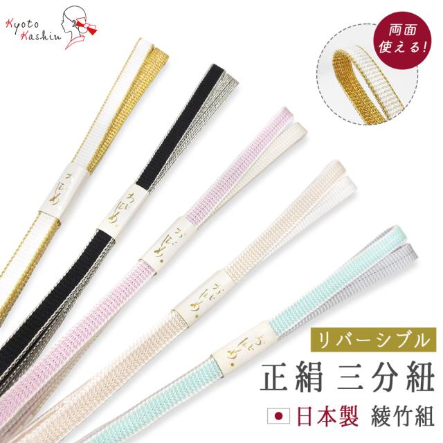 正絹 三分紐 日本製 リバーシブル 幅9mm 綾竹組 帯締め 絹100% 金属糸 両面 約125cm 3分紐 / 新作 くすみ パステル 和装小物 着付け小物 レディース 女性 / 通年用 お洒落 カジュアル 着物 色無地 小紋 紬 デニム 浴衣 夏着物