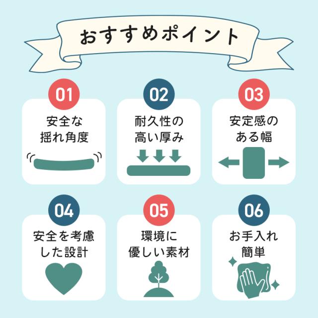 | 【多機能バランスボード】 シーソーにも木馬にもなるバランスボード! 遊びながらバランス感覚を鍛えよう! 【おうちで楽しく運動♪】 現代の子どもたちは運動の機会が少ない…。 ケガをしたり体調を崩したりしやすくて心配。 そんなお悩みをこのバランスボードが解決します◎ 【遊び方いろいろ】 バランスボードだけでなく ハンモックやテーブルにすることもできます! 遊び方は無限大! 【部品を外して木馬になる】 組み替えるとバランスボードから木馬に変身! またがってゆらゆら遊べます! 【安全な揺れ角度】 揺れの角度は0°〜35° 転倒の心配はなく 子どもが安心して全力で楽しめる角度です。 【耐久性の高い厚み】 市販の木製ボードよりも厚い約3.5cm。 強度も強く耐久性が高いので安心して遊べます! 【親子で一緒にエクササイズ♪】 ひとりでは不安なお子さまも安心! 耐荷重75kgなので大人も乗ることができます! 【安定感のある幅】 幅85cmの幅広いボード。 床との接触面が多いので揺れても転倒しにくくなっています! 【安全を考慮した設計】 丸みを帯びた設計なので小さなお子さまでも安心して触れることができます! 滑り止めシートが付いており フローリングなどのすべりやすい床での転倒を防ぎます! 【環境に優しい素材】 環境に優しいPE素材を使用。 軽量で破れにくく 毒性が低いので安全性が高い素材です! 【お手入れ簡単】 水洗いOK! カビに強く 色が落ちる心配はありません! |