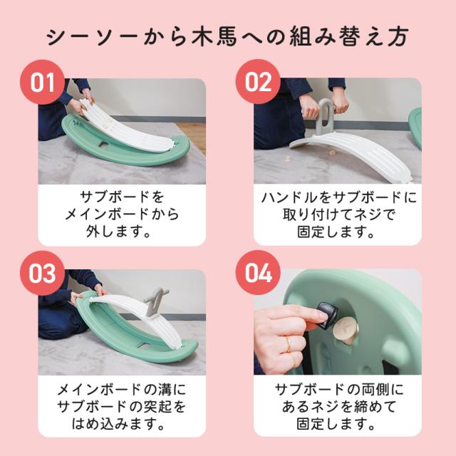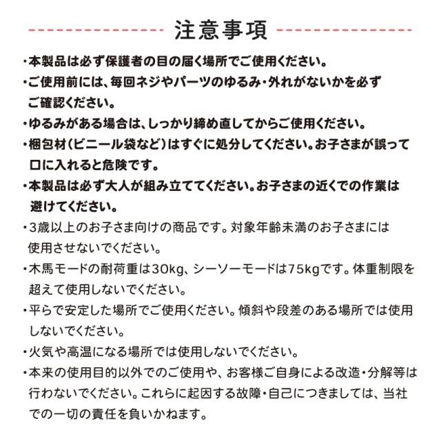 | ※本製品は必ず保護者の目の届く場所でご使用ください。 ※ご使用前には 毎回ネジやパーツのゆるみ・外れがないかを必ずご確認ください。 ※ゆるみがある場合は しっかり締め直してからご使用ください。 ※梱包材(ビニール袋など)はすぐに処分してください。お子さまが誤って口に入れると危険です。 ※本製品は必ず大人が組み立ててください。 お子さまの近くでの作業は避けてください。 ※3歳以上のお子さま向けの商品です。 対象年齢未満のお子さまには使用させないでください。 ※木馬モードの耐荷重は30kg シーソーモードは75kgです。 体重制限を超えて使用しないでください。 ※平らで安定した場所でご使用ください。 傾斜や段差のある場所では使用しないでください。 ※火気や高温になる場所では使用しないでください。 ※本来の使用目的以外でのご使用や お客様ご自身による改造・分解等は行わないでください。 これらに起因する故障・自己につきましては 当社での一切の責任を負いかねます。 |