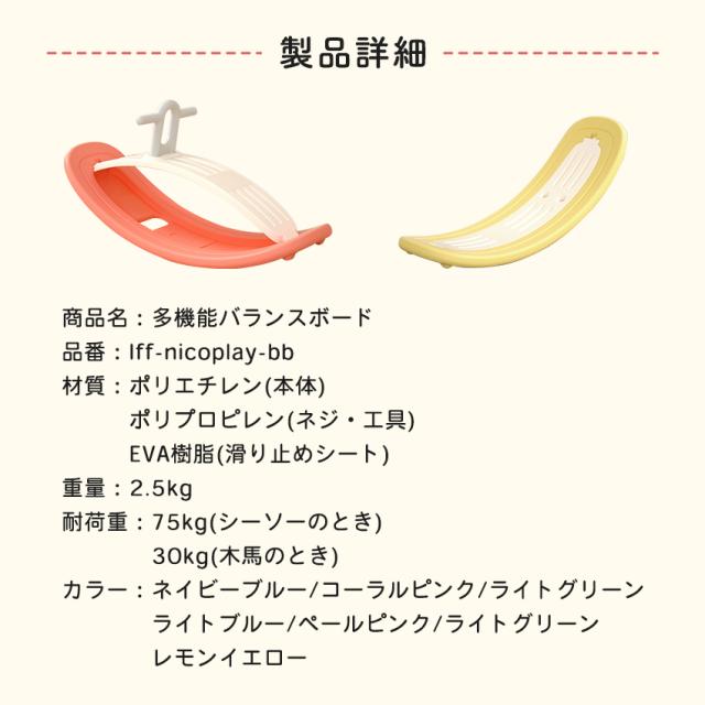 | 製品名:多機能バランスボード 品番:lff-nicoplay-bb サイズ:850×300×410mm(木馬モード) 850×300×200mm(シーソーモード) 重量:約2.5kg 材質:ポリエチレン、ポリプロピレン、EVA樹脂 色:ネイビーブルー・コーラルピンク・ライトグリーン・ライトブルー・ペールピンク・ディープグリーン・レモンイエロー セット内容:メインボード/サブボード/ハンドル/滑り止めシート/中ナット/小ナット/締め付けネジ |