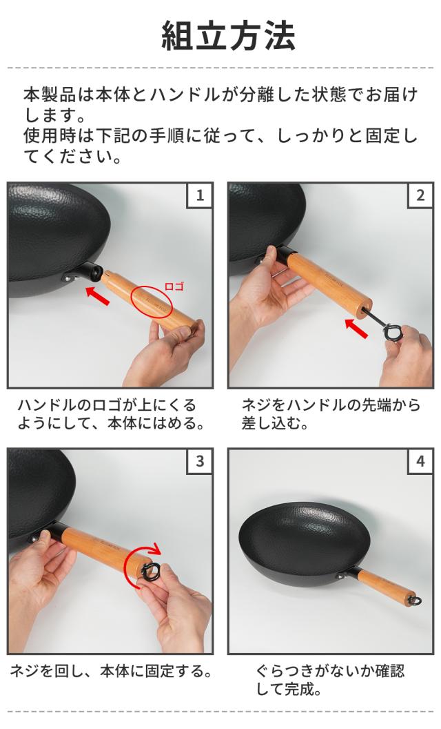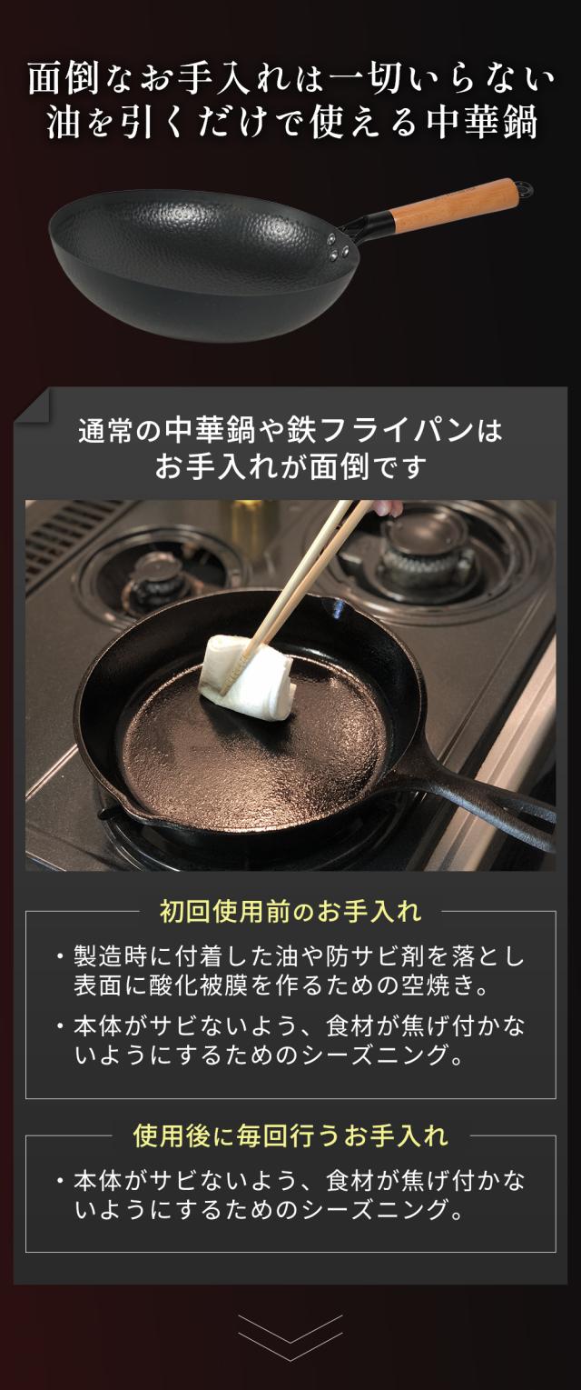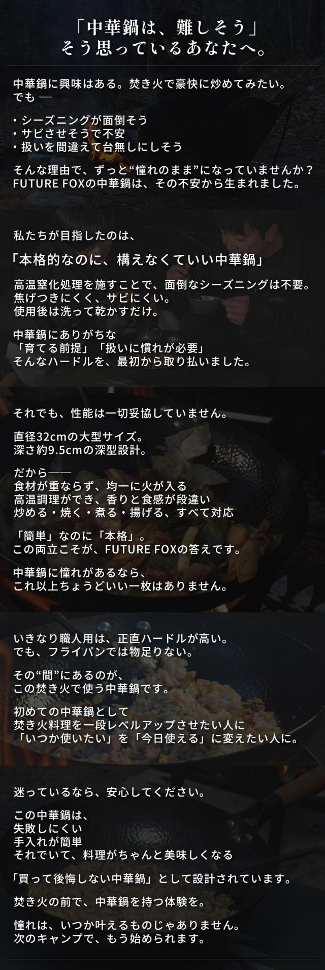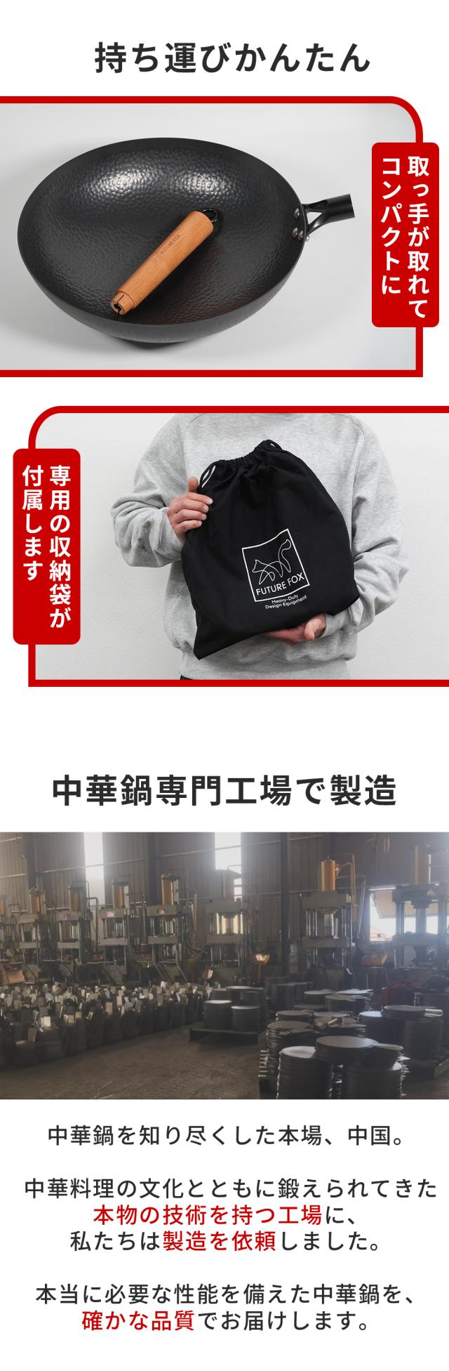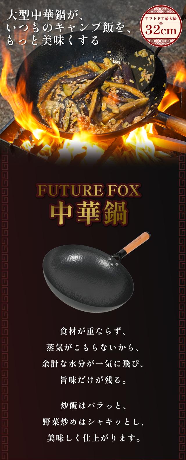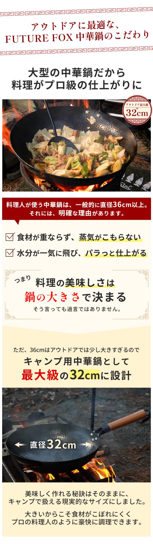 中華鍋 FUTURE FOX アウトドア専用 【空焼き/シーズニング不要】直径 32cm 深型 大型 キャンプ 取っ手が取れる 手入れ簡単 窒化処理 直火対応 分離式 鉄鍋