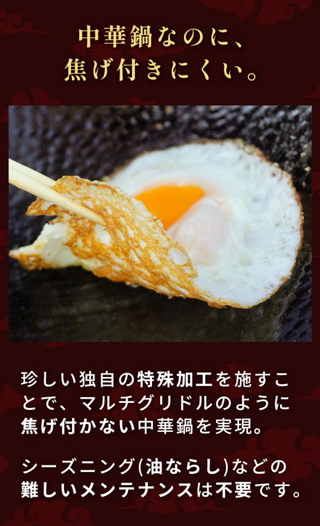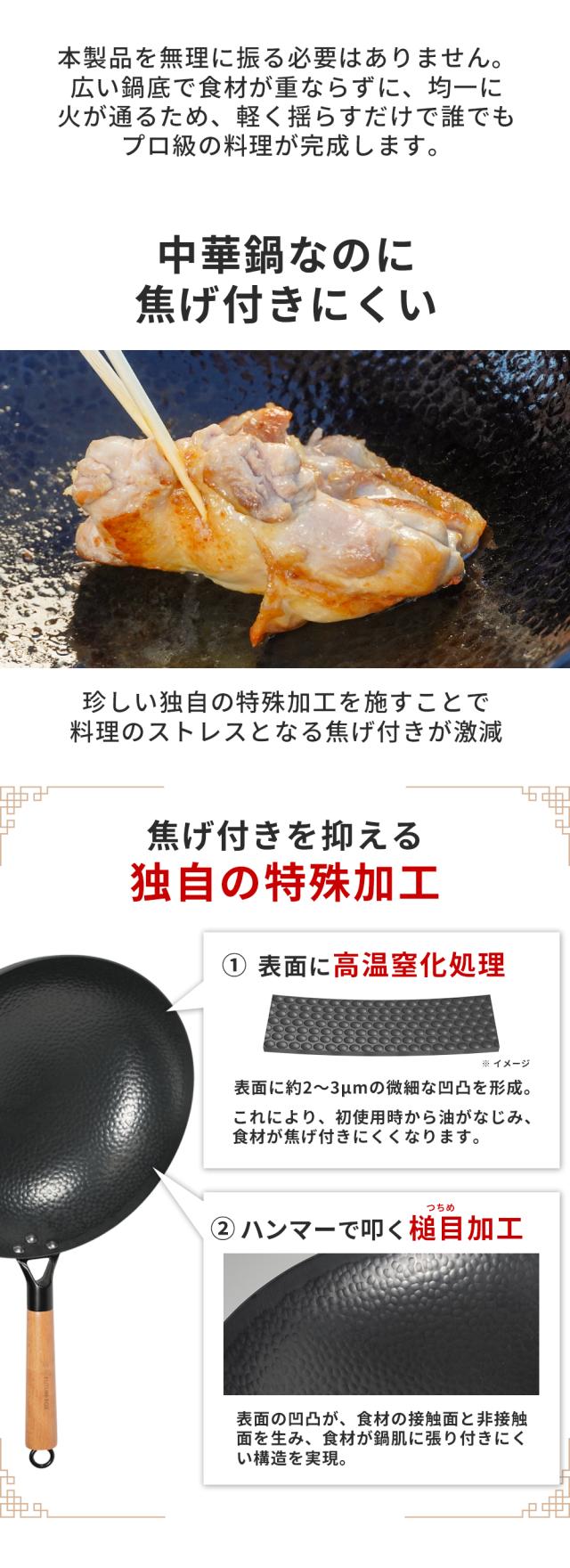 高温窒化処理と槌目加工により、シーズニング不要で最初から焦げ付きにくく、使用後はサッと洗うだけ。