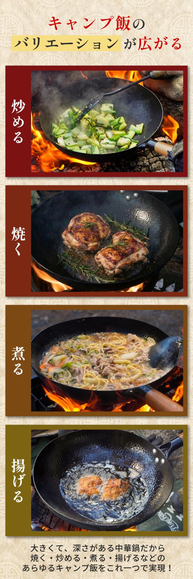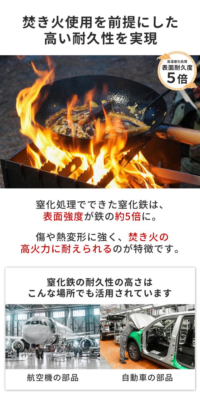 焚き火やガスバーナーに対応し、キャンプでも本格中華を楽しめます。