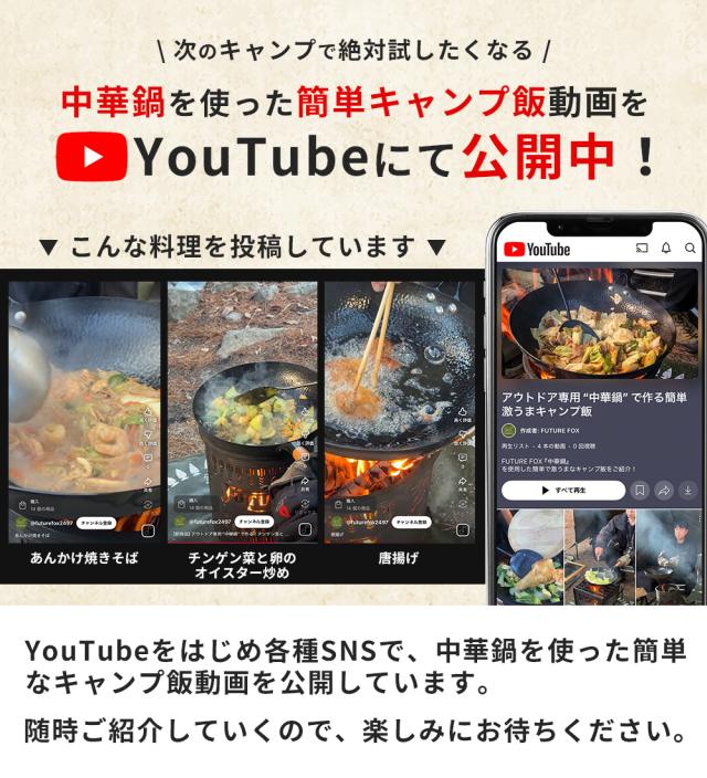 本来の中華鍋の魅力をアウトドアで手軽に楽しめる、FUTURE FOXのアウトドア専用中華鍋です。