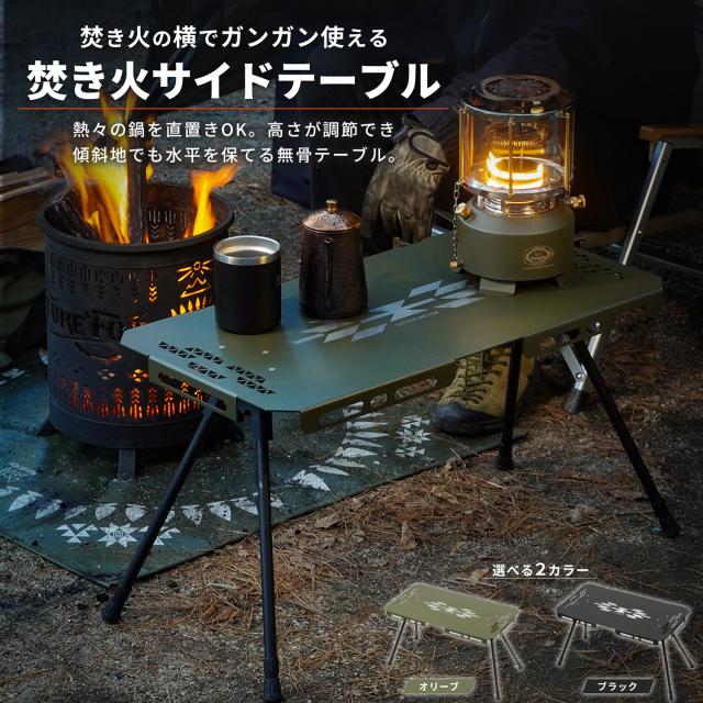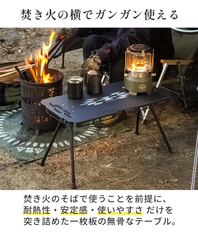 焚き火のすぐそばでも安心してガンガン使える、耐熱性と安定感を備えた無骨なサイドテーブルです。
