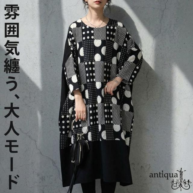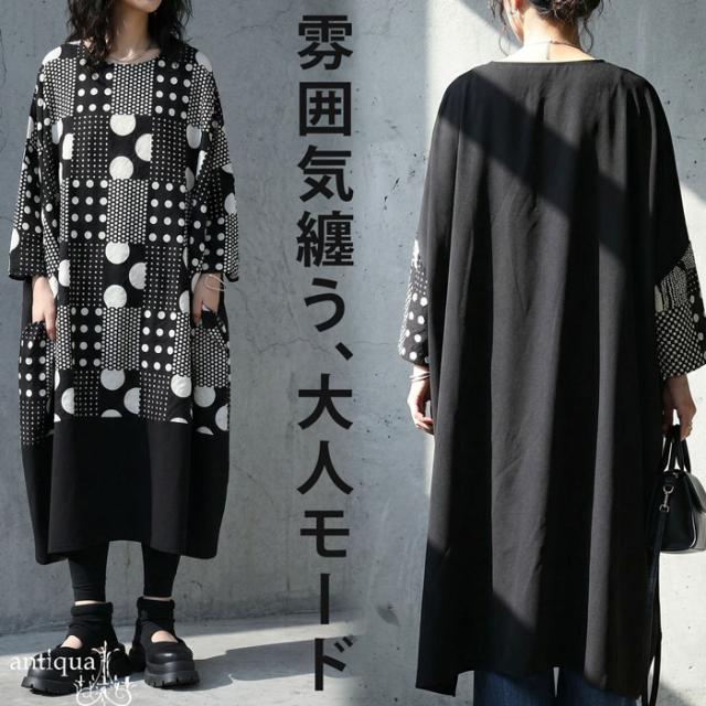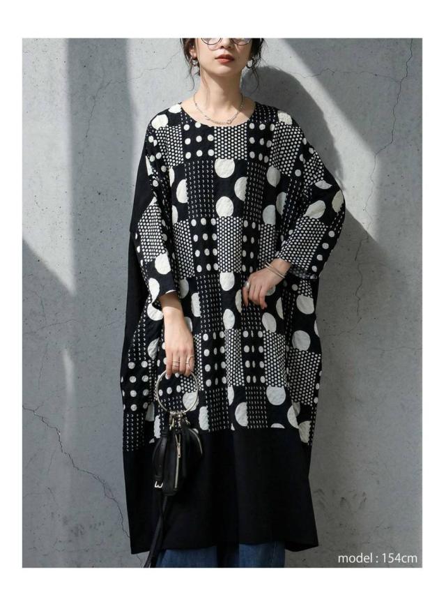 pa-03949 ドット切替 水玉 パッチワーク風 レディースワンピース ミモレ丈 ラウンドネック 体型カバー ゆったり カジュアル モノトーン コクーンシルエット ロングトップス 大きいサイズ