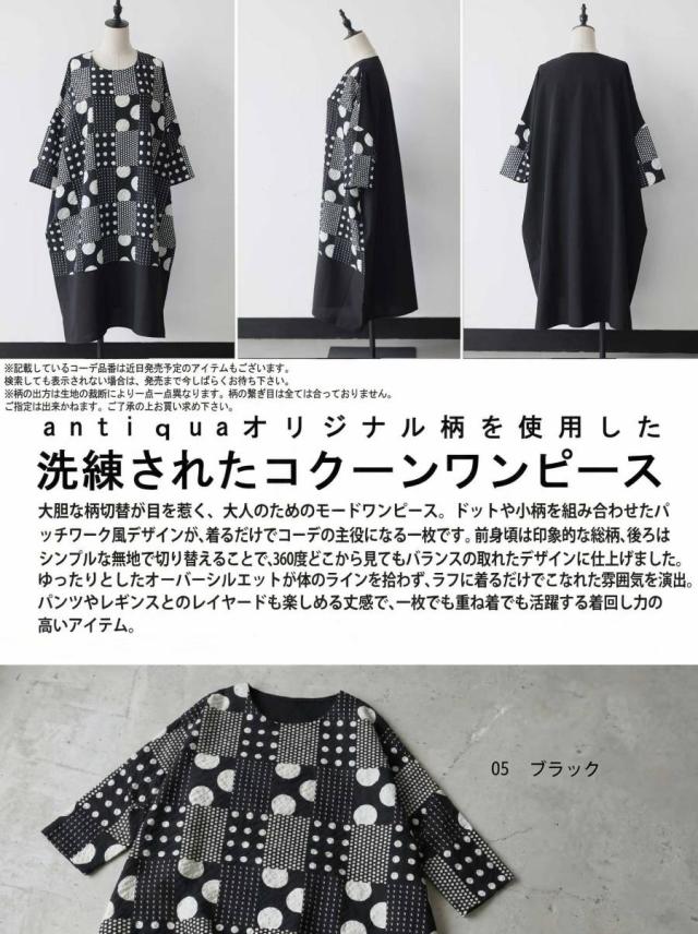 大小のドット柄(水玉)を組み合わせたパッチワーク風デザインが印象的なコクーンワンピースです。