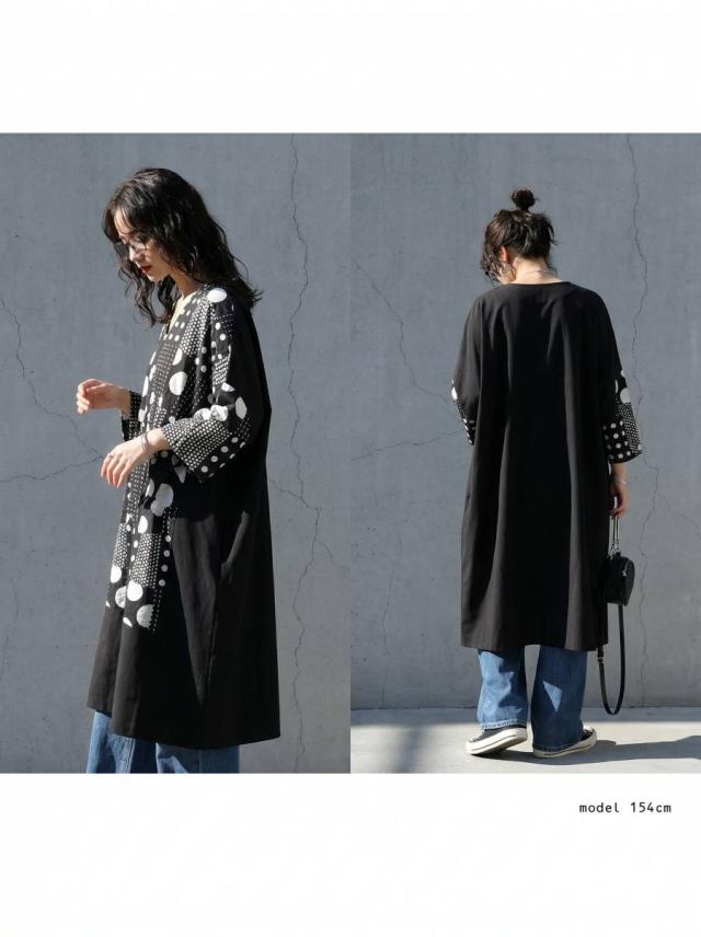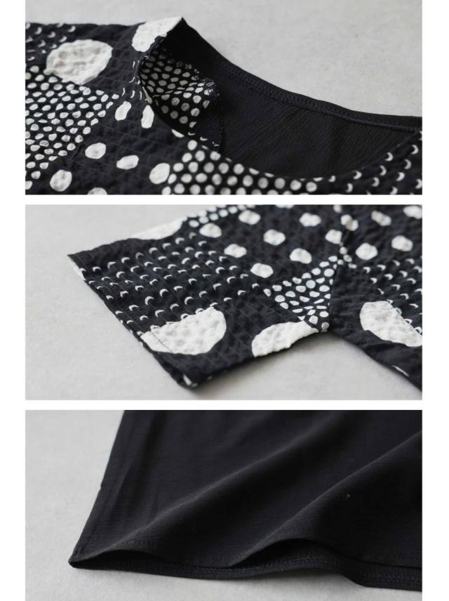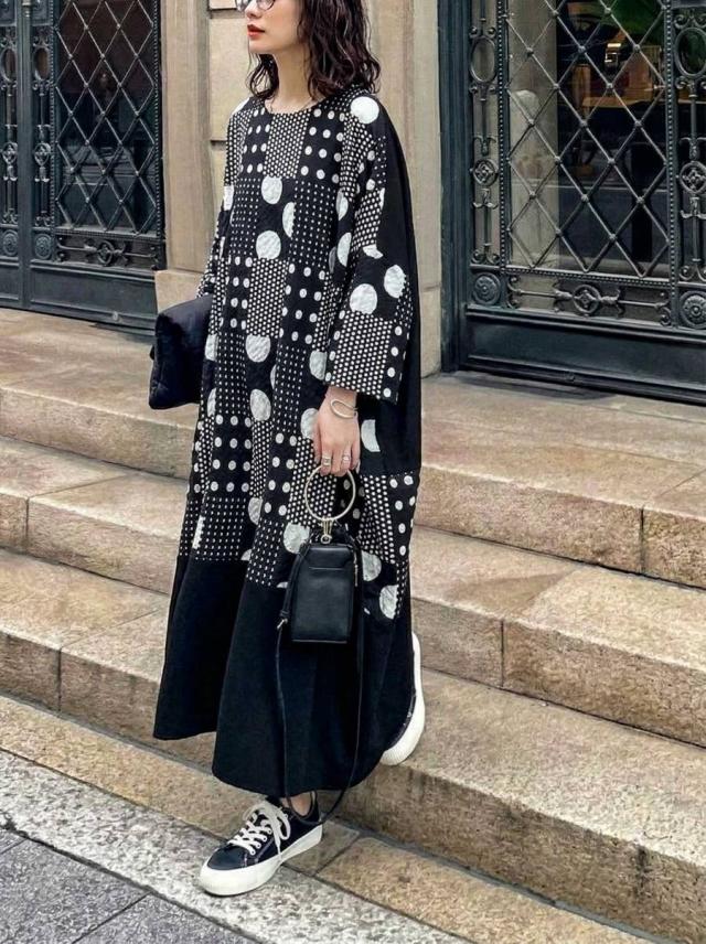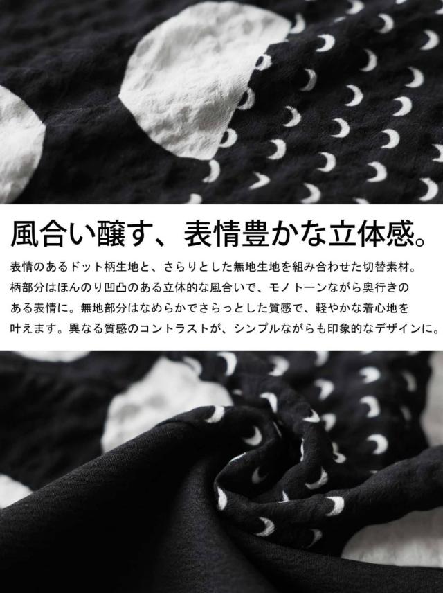 前身頃はドット切替のパッチワーク風デザイン、後ろはシンプルな無地で仕上げたモノトーンの配色が、大人カジュアルな雰囲気を引き立てます。