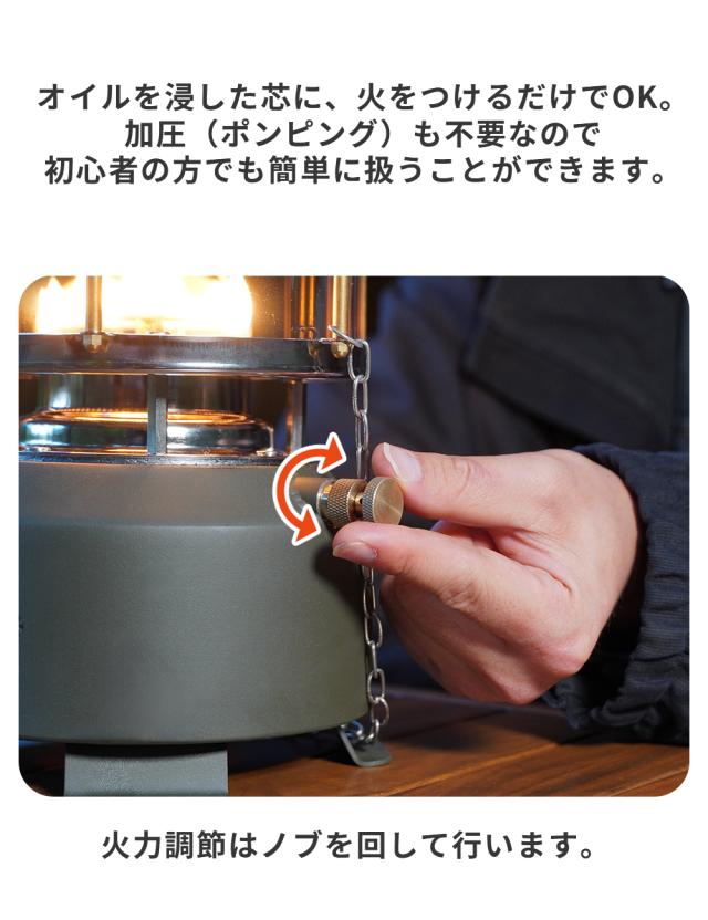 パラフィンオイルを使用するため煤や臭いが少なく、手軽に扱えるのも魅力。
