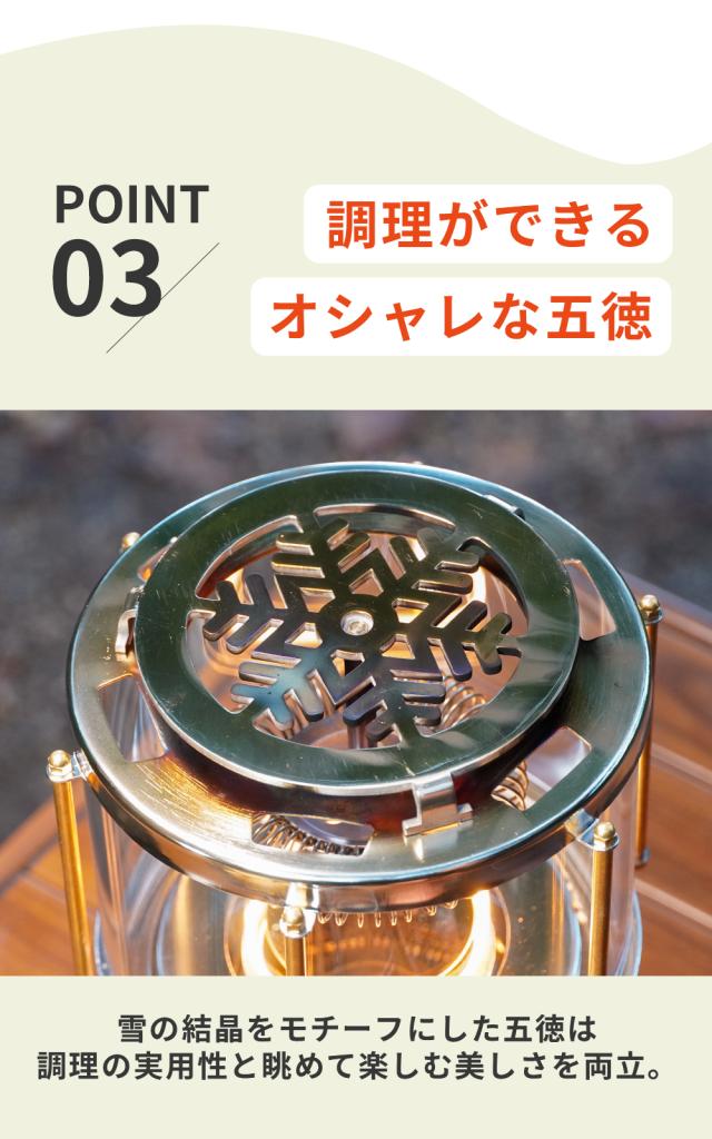 災害時の暖房・照明・簡易調理にも役立つ、デザイン性と実用性を兼ね備えたギアです。