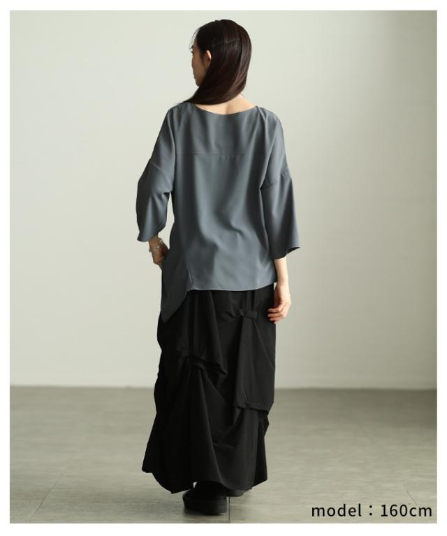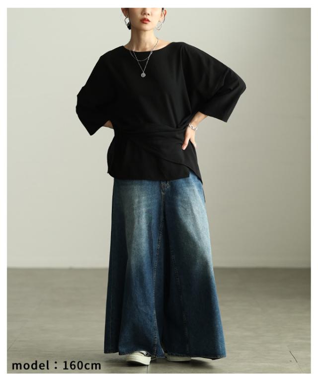 着丈は太もも付け根が隠れるくらいです。サイドの長い部分をループに通して着用するデザインで適度なドレープでシルエットがきれいです。袖は8分袖くらいです。ドロップショルダーで脇ぐりも身幅も余裕があり楽に着用できました。さらりとした生地で肌触り良く、単体でもレイヤードしてもコーデが楽しめそうです。