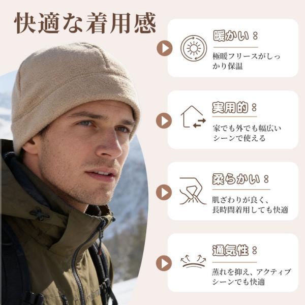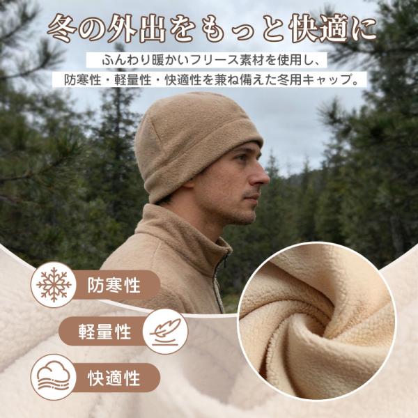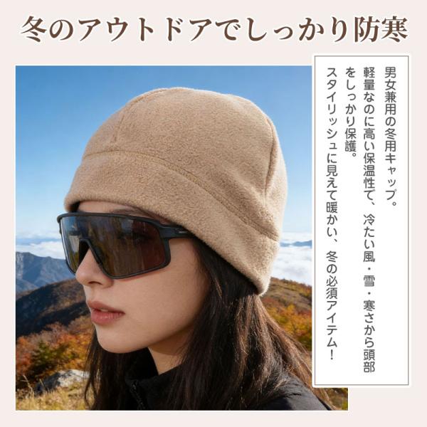 冬の外出やアウトドアに最適なフリース防寒キャップ。