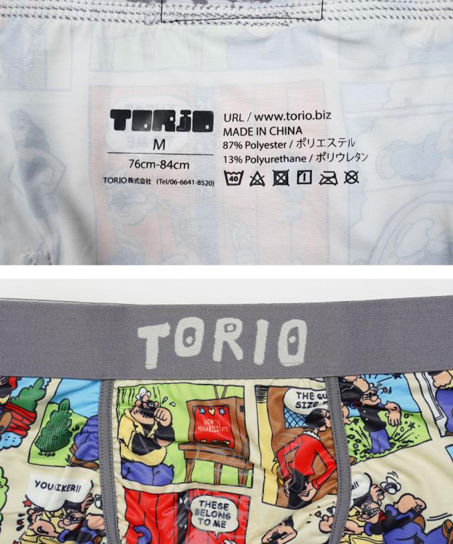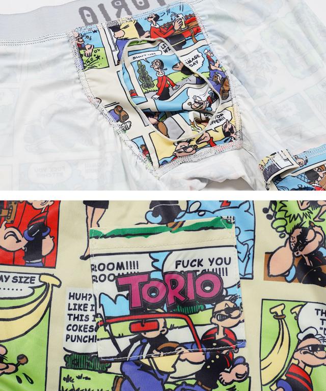 レトロコミックのタッチで描かれた水兵さんたちが印象的!TORIO(トリオ)のメンズボクサーパンツ。ポン引きの水兵さんと娼婦と、娼婦に恋をした不毛な男の物語。隠し蓄光デザインで暗闇になると光って浮き出てくるのは・・?つるっとした肌触りのポリエステル素材に伸縮性を加えた速乾性のある生地でフィット感抜群の穿き心地。フロントポケットは一度体感すると病みつきに。