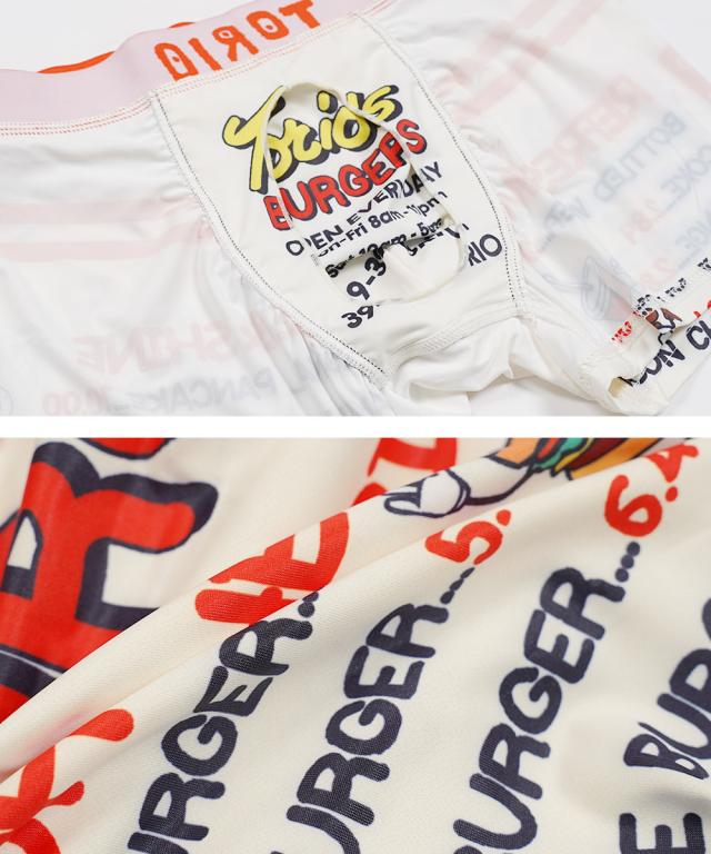 レトロなアメリカンダイナー風!TORIO(トリオ)のメンズボクサーパンツ。TORIOが営む、架空のバーガーショップ。メニュー表記やドリンクキャラまで見ていて飽きないデザイン!隠し蓄光デザインで暗闇になると光って浮き出てくるのは・・?つるっとした肌触りのポリエステル素材に伸縮性を加えた速乾性のある生地でフィット感抜群の穿き心地。フロントポケットは一度体感すると病みつきに。
