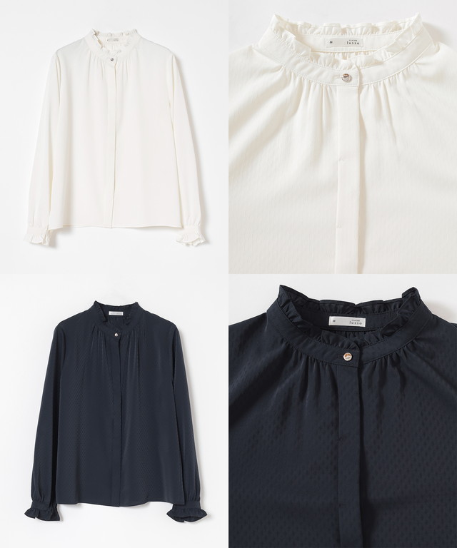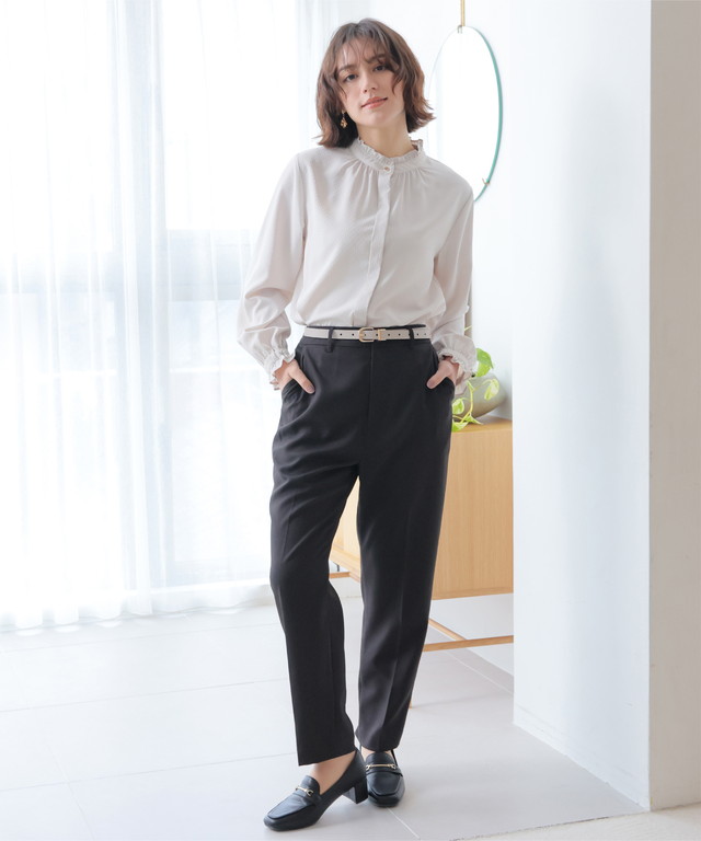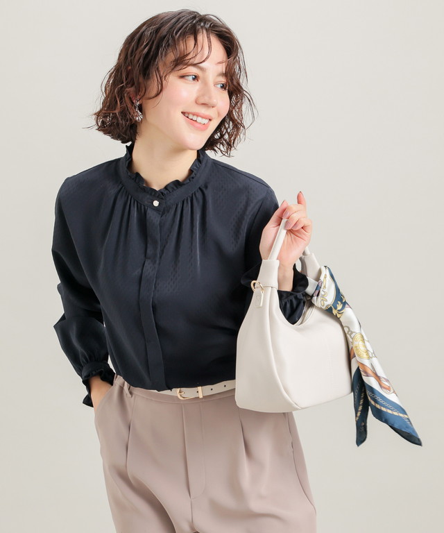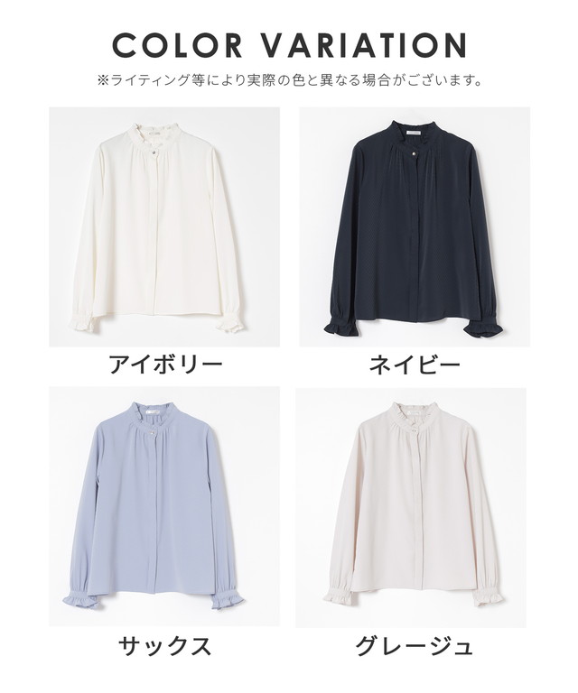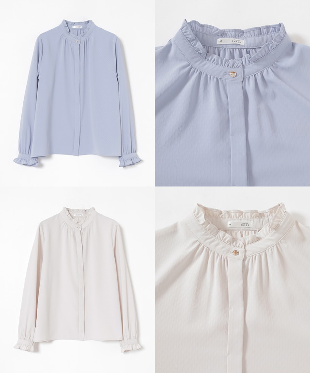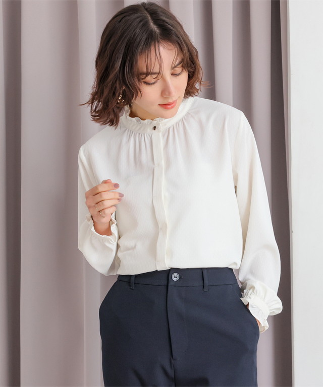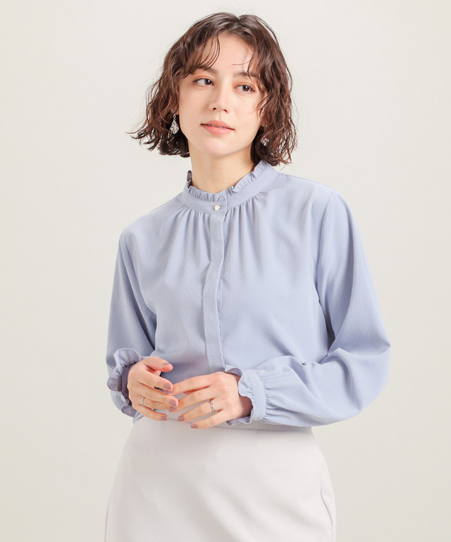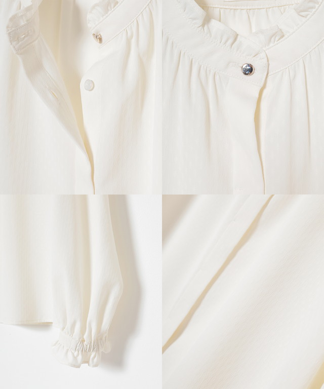 スタンドネックの衿ぐりと袖口にフリルを付けたフェミニンなデザイン。