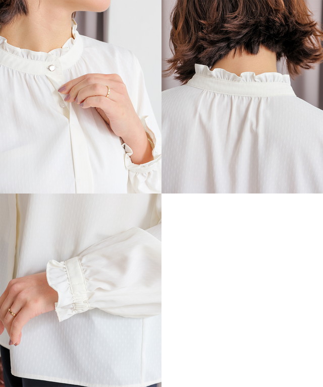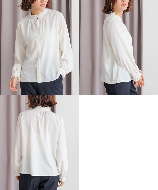 トップス ブラウス 長袖 スタンドネック フリル フロントボタン 比翼仕立て フェミニン オールシーズン 白 レディース Honeys ハニーズ スタンドフリルブラウス