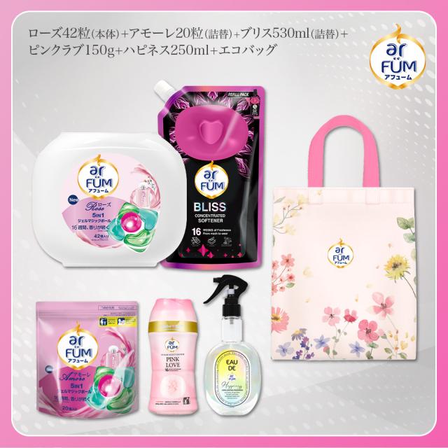 【新商品】アフューム 洗濯洗剤 柔軟剤入り洗剤 ローズ 本体42粒 アモーレ詰め替え20粒 ファブリックスプレー ハピネス250ml 柔軟剤 ブリス530ml 香りビーズ ピンクラブ150g エコバッグ付き 部屋干し 抗菌 消臭 防臭 洗濯グッズ セット