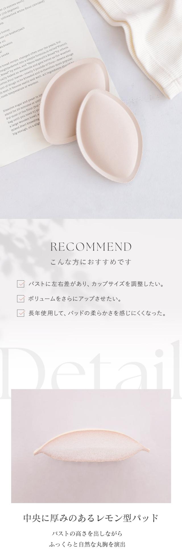 tu-hacci Inner Collection ブラパッド単品 〜楽盛りインナー BRAmone(ブラモネ)シリーズ〜 程よい厚みのレモン型パッド ブラやインナーのサイズ微調整が可能に。 「バストの左右差が気になる」「産前産後でサイズが変わってしまった」 といったお悩みを持つ方にもおすすめです。 柔らかなレモン型がバストに優しくフィットし、自然なボリューム感を演出します。 ※デザインによっては、パッドがカップからはみ出す場合がございます。 あらかじめご了承ください。 ≫ ギフトラッピングはこちら ≪ |