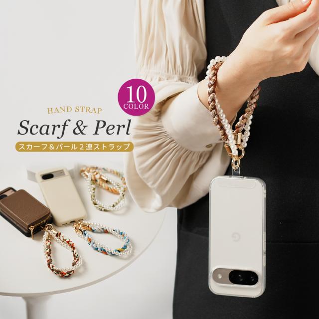 ロープ状に編まれたスカーフ生地と小粒パールの組み合わせが美しい2連ハンドストラップ