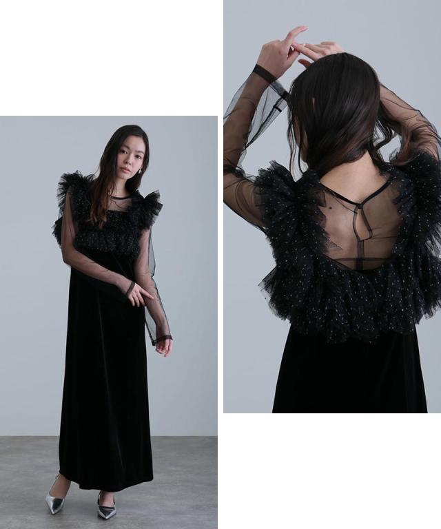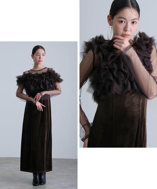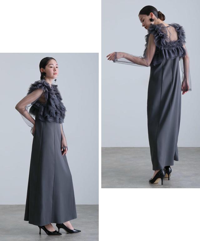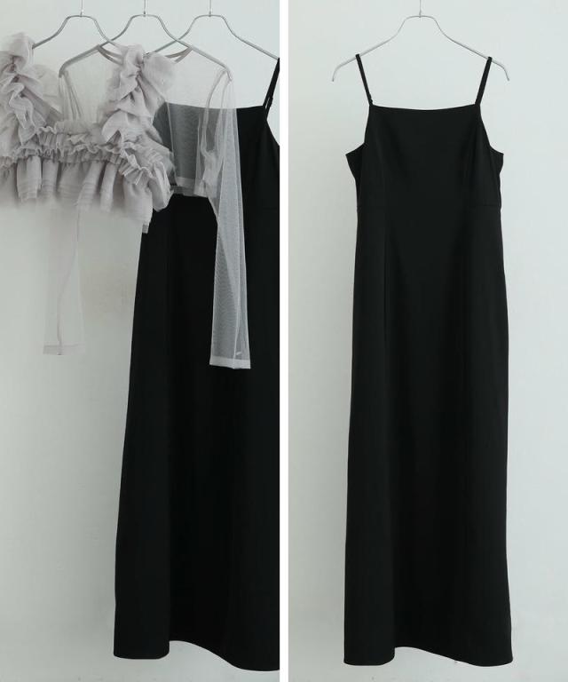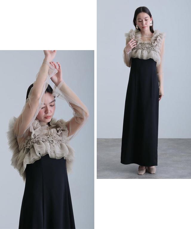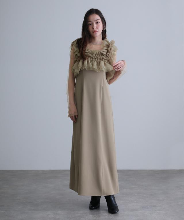 キャミワンピース・チュールインナー・フリルベストが揃った、大人フェミニンな3点セットドレス。