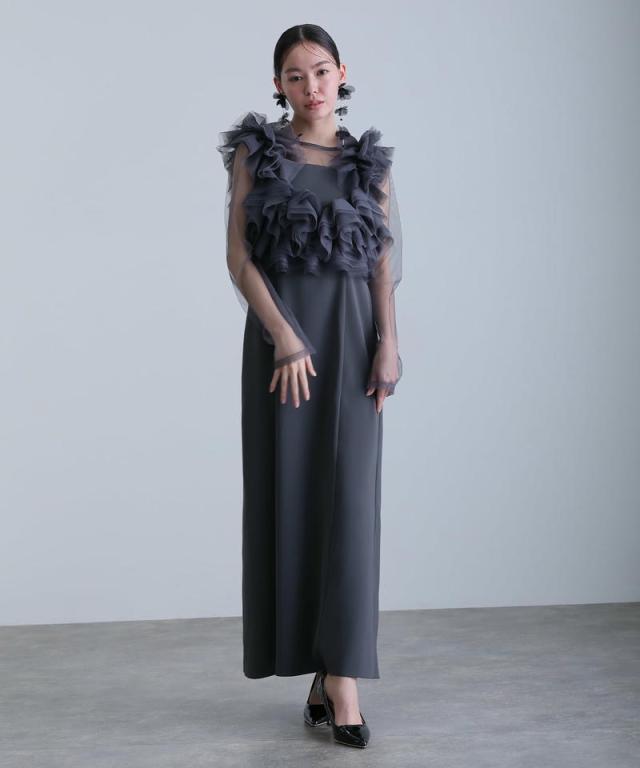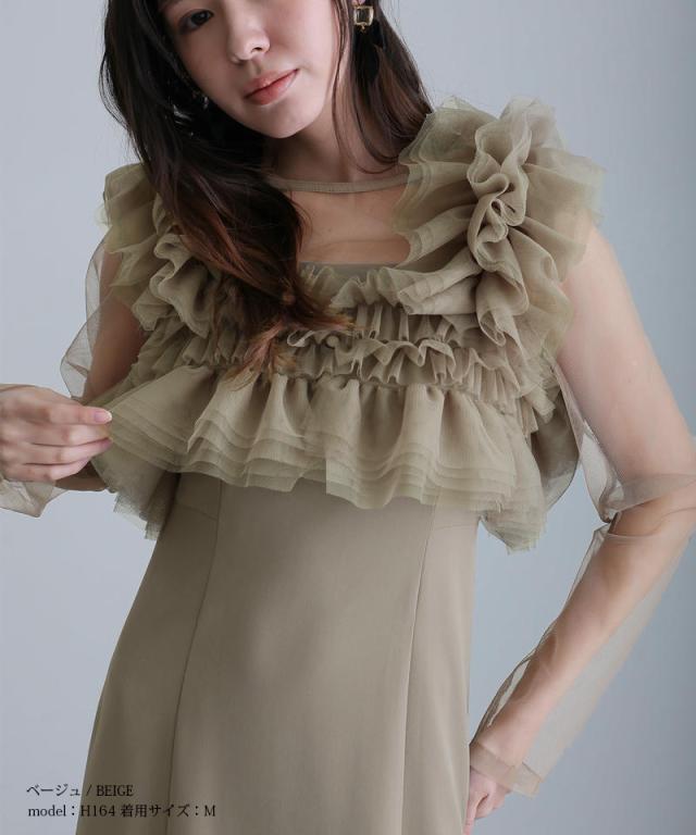 ボリュームラッフルレイヤードレス【565251178】10代・20代・30代・40代・50代・ドレスワンピ・フォーマルワンピ・パンツドレス・服装・ワンピース・ドレスカジュアル・ブランド・七分袖・長袖・ロング・膝丈・薄手・厚手・無地・刺繍・脚長効果・伸縮性・キレイめ・着やせ・体型カバー・スタイルアップ・レース・リボン・ドレープ・小さいサイズ・3Lや4L・かっこいい・かわいい・即日発送・送料無料・結婚式・婚活・披露宴・顔合わせ・発表会・演奏会・二次会・同窓会・お呼ばれ・食事会・謝恩会・親族・七五三・お宮参り・冠婚葬祭・弔事・女子会・韓国・デート・入学式・卒業式・入園式・卒園式・ママ・ピアノ・マタニティー・セレモニー・セレブ・パーティー