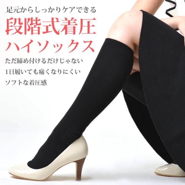 年間定番☆婦人着圧ハイソックス3足組 無地ブラック