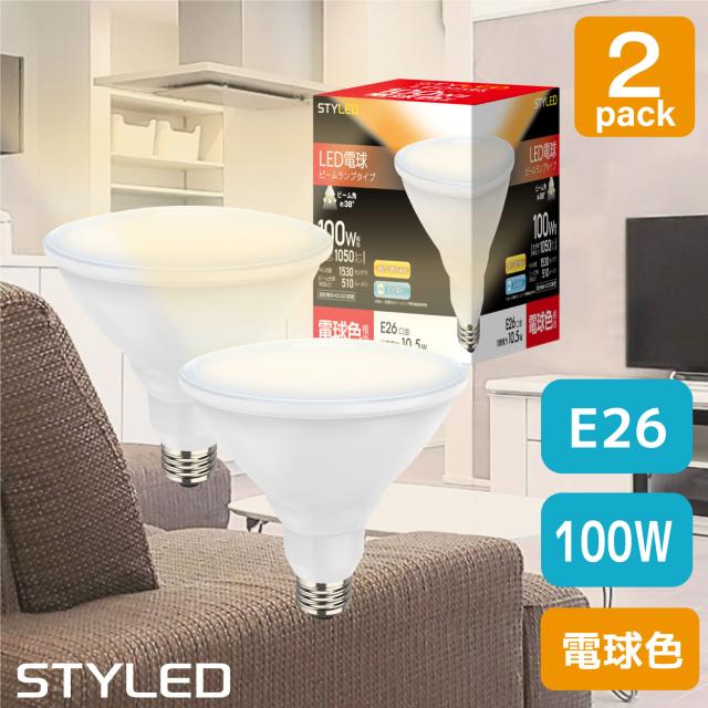【2個セット・1個当たり1,080円】LED電球 E26口金 ビームランプ形 ビーム電球 100W相当 消費電力10.5W 防水 防雨 電球色 1050lm STYLED HDRP38-100-L